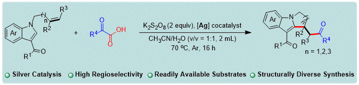 22) K2S2O8-mediated acylarylation of unactivated alkenes via acyl radical addition/C-H annulation cascade of N-allyl-indoles with silver cocatalysis, Jitan Zhang,* Manyi Wu, Hu Ju, Haitao Yang, Ke Ding, Li Zhu, Jiaping Wu,* and Meihua Xie*, Org. Chem. Front. 2022, DOI: 10.1039/d1qo01069g.