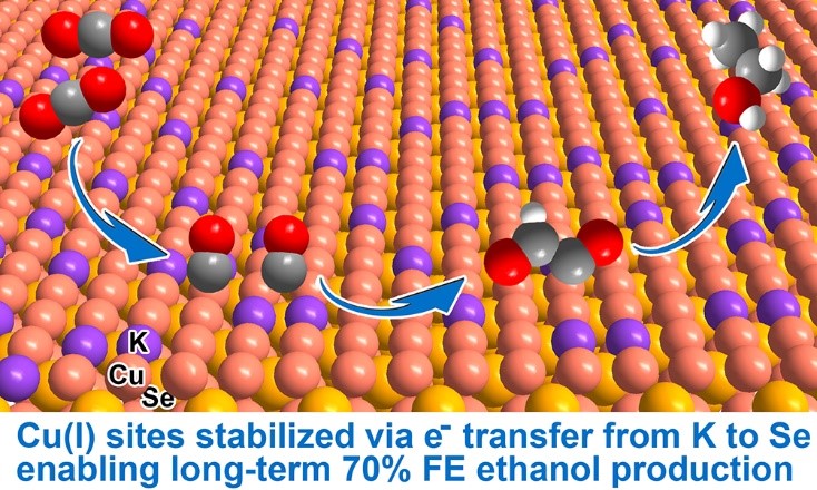 将二氧化碳电化学还原(CO2ER)为高能量密度的燃料和原料是储存可持续能源和解决气候问题的重要途径。然而,由于C-C耦合的低可控性,有效开发将二氧化碳电催化还原成高选择性C2+产品的催化剂仍然是一个挑战。在本文中作者提出了一种新的策略:将K+离子掺杂进入Cu2Se纳米片阵列,调整CO2ER中Cu位点和反应中间体之间的相互作用,实现高选择性产生乙醇。该催化剂在−0.8 V的电位下可以产生法拉第效率为70.3%的乙醇,并具有130小时的持久稳定性。这项工作揭示了通过碱金属掺杂控制CO2ER过程中关键反应中间体,为高选择性的多质子耦合电子转移反应提供了一种合理的催化剂设计策略。