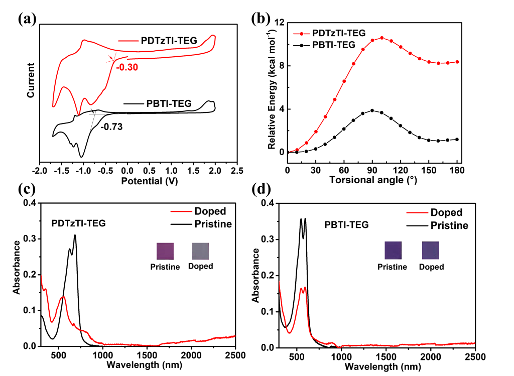 近日,我校史永强课题组与东华大学孙恒达教授、瑞典林雪平大学Simone Fabiano教授和南方科技大学郭旭岗教授合作,合成了含有极性侧链的噻唑酰亚胺构建单元,并在此基础上得到了全受体均聚物PDTzTI-TEG。含有极性侧链噻唑酰亚胺的合成与之前报道的含有普通烷基链噻唑酰亚胺的合成完全不同,极性侧链受体单元的合成更具有挑战性。DTzTI-TEG单体的成功合成丰富了聚合物结构的多样性,尤其是受体-受体型聚合物。在N-DMBI掺杂剂掺杂下,PDTzTI-TEG获得了较高的电导率(σ = 34 S cm-1)和功率因子(PF = 15.7 μW m-1 K-2),这些值远远高于PDTzTI(σ = 4.6 S cm-1)和PBTI-TEG(σ = 0.2 S cm-1)的热电性能。结果表明,在聚合物上同时引入缺电子噻唑单元和极性侧链能够有效提高有机热电性能。
