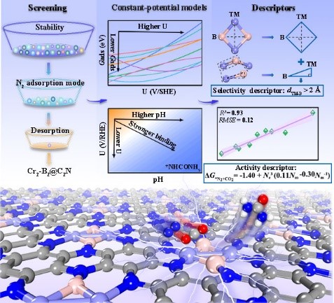 黄玉成教授课题组在第一性原理的框架下,结合数据驱动技术,在26种四重TM2-B2活性位负载的多孔C2N单层中,筛选出Cr2-B2@C2N为最有前途的电催化剂,其在中性环境中具有–0.37 V(vs RHE)的低极限电位。该电催化剂的高选择性和活性可分别用几何结构描述符和电子结构描述符来解释,这些描述符与TM-B距离、d电子的数量和TM原子的电负性密切相关。在筛选过程中,几何描述符可将范围缩小到前过渡金属体系,而电子描述符锁定含Cr的体系。这一研究结果为尿素的电化学合成提供了一个新的视角,有助于合理设计高效的尿素合成电催化剂。