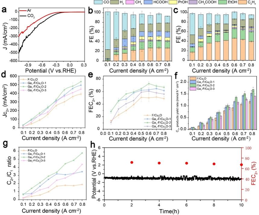 近日,我校耿保友教授课题组构建了单原子Ga锚定的F掺杂介孔Cu2O双活性位点催化剂(Ga1-F/Cu2O)。其中的F-离子和氧空位(OVs)形成的Lewis酸碱对作为第一活性位点,Ga单原子为第二活性位点。原位光谱测试和DFT计算表明,Lewis酸碱对可以有效增强CO2的吸附和活化,产生更多的*CO中间体,而Ga单原子的加入加速了水分子的解离,并显著提高了对*CO和*H的吸附能,降低了*CO到*CHO的能垒,从而改变了反应路径。与传统的C-C偶联(*OCCO)相比,质子化后的C-C偶联(*OCCHO)是一个下坡反应,使C-C偶联自发进行。结果表明,Ga1-F/Cu2O催化剂对C2+产物的电还原效果良好,C2+产物的偏电流密度为456 mA cm−2,法拉第效率为72.8±3.2%。