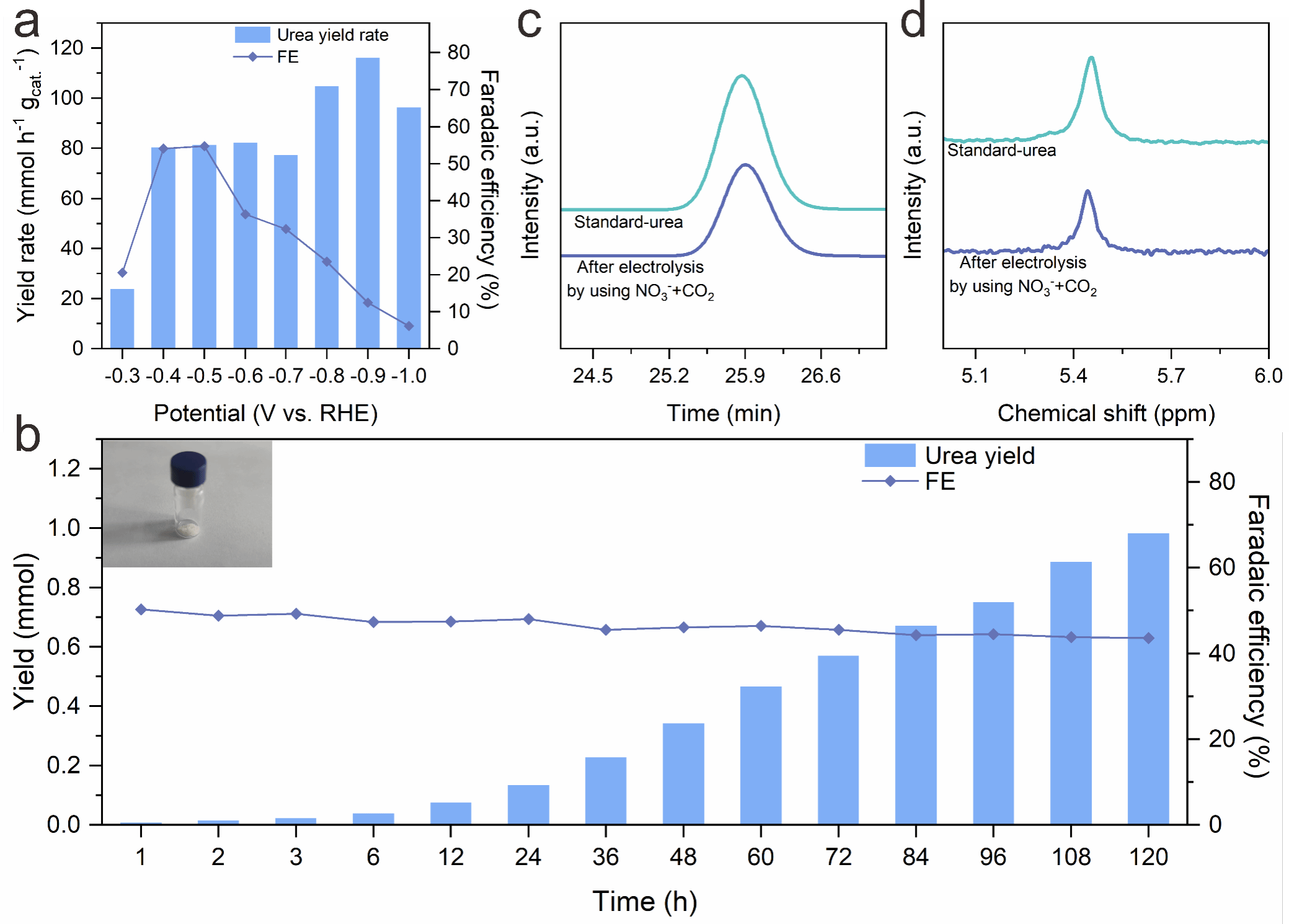 为了进一步验证该催化剂的工业应用潜力,研究团队在流动池中进行了长时间电解实验。在-0.5 V vs. RHE的条件下,持续电解120小时后,成功获得了59.09 mg的尿素,展现了出色的连续生产能力。
