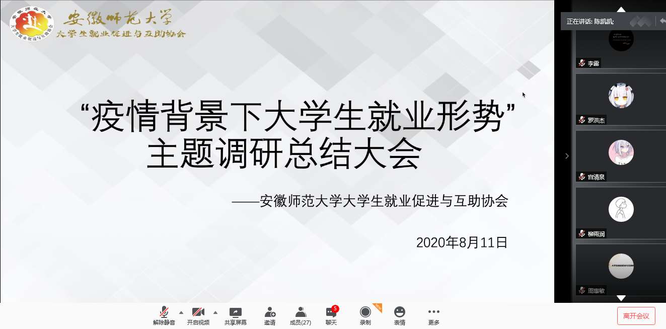 暑期“疫情背景下大学生就业形势”主题调研团队于线上召开实践总结大会,此次会议由队长陈凯凯主持,全体团队成员参会。