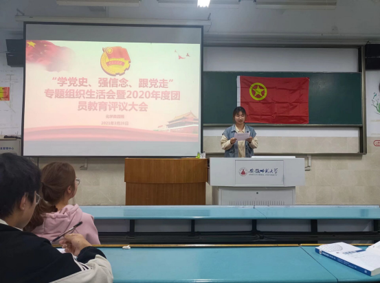 朱会凌)为提升我班团支部组织力,进一步增强基层团组织的吸引力、凝聚力和战斗力,根据《中国共产主义青年团支部工作条例(试行)》,按照“三会两制一课”的制度要求,化学类专业2020级四班本科生团支部于3月28日晚在固定教室开展团支部“学党史、强信念、跟党走”专题组织生活会暨2020年度团员教育评议工作,本次会议由团支部书记尹思燃主持。