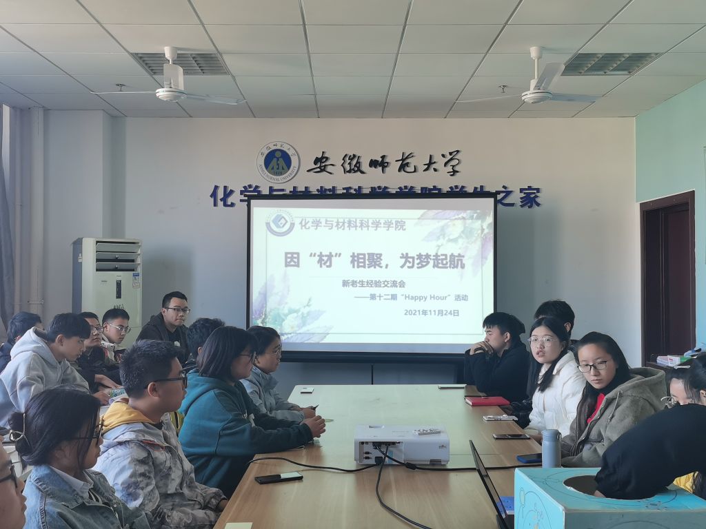 殷乐)为了帮助2021级新生尽快适应大学生活,掌握正确学习方法,进一步调动学生学习的积极性,营造珍惜时间、刻苦钻研的氛围,2021年11月24日下午,院学生会生活权益部在717活动室举办“因‘材’相聚,为梦起航”为主题的第十二期“Happy hour”活动,来自2018级、2019级优秀学生代表们与2021级新生代表进行学习、工作、生活上的经验分享,共话成长心得。本次新老生经验交流会由院学生会主席团汝晓玉主持,