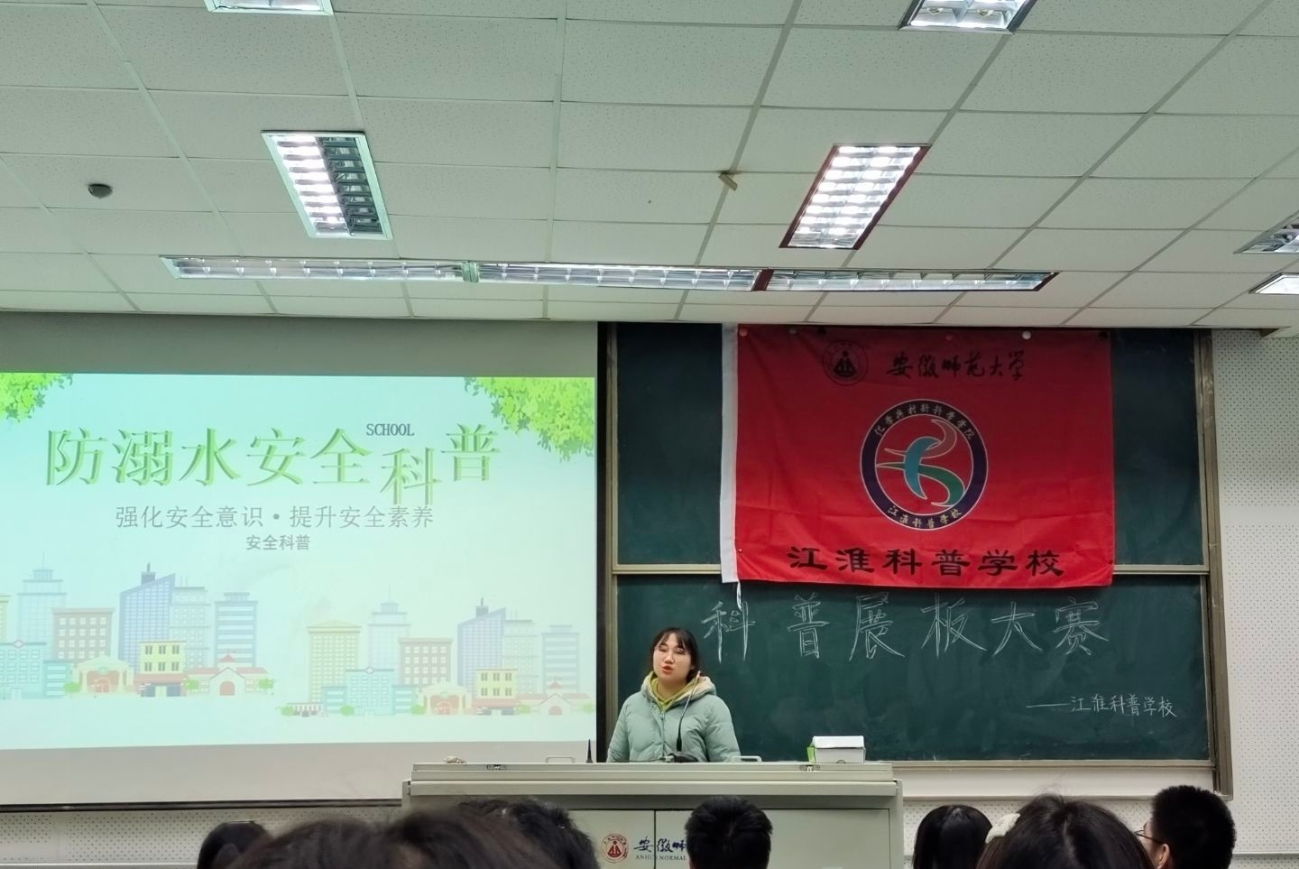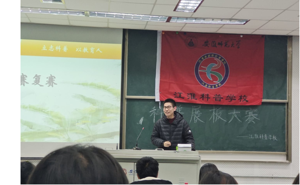 施妍琦、杨俊娜)为激发学生对科学知识的学习兴趣,使同学们热爱生活、热爱科学,在2021年11月27日晚七点在2070401教室,江淮科普学校志愿服务组织举办科普展板大赛复赛。比赛得到芜湖市化学化工学会的指导和学院的大力支持,江淮科普学校副校长翁森翔、就业促进与互助协会会长陈慧娟、环境保护协会会长邵孟玉、教学基本功大赛一等奖获得者王宇阳、苦难辉煌征文比赛院一等奖获得者陶佳佳出席本次活动。