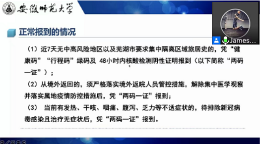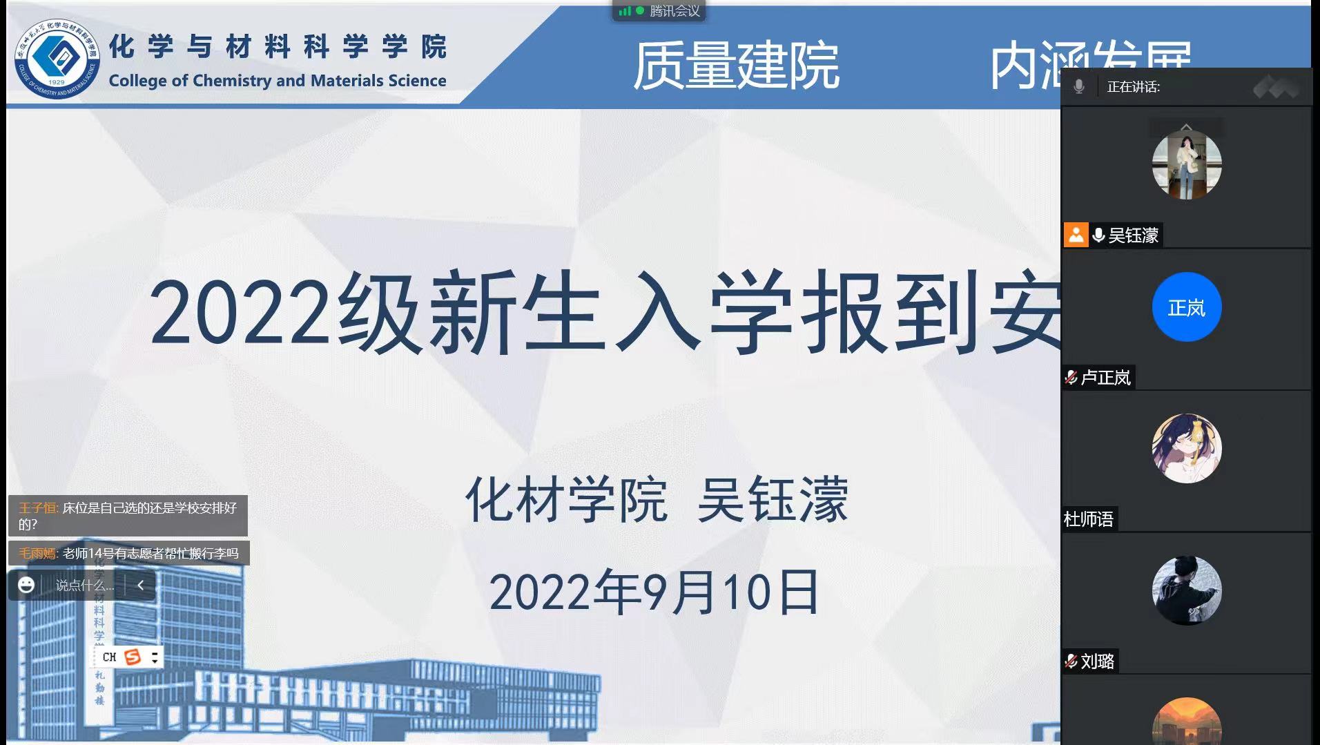 吴瑶、张薇)为帮助同学们调整好开学状态,进一步贯彻落实学校关于学生返校前后的要求,确保返校后各项工作顺利展开,9月10日、11日,2022级本科生辅导员吴钰濛、张浩,研究生辅导员张薇分别召开本科生、研究生新生入学线上主题班会,加强学生返校的疫情防控管理、安全教育、开学秩序管理。