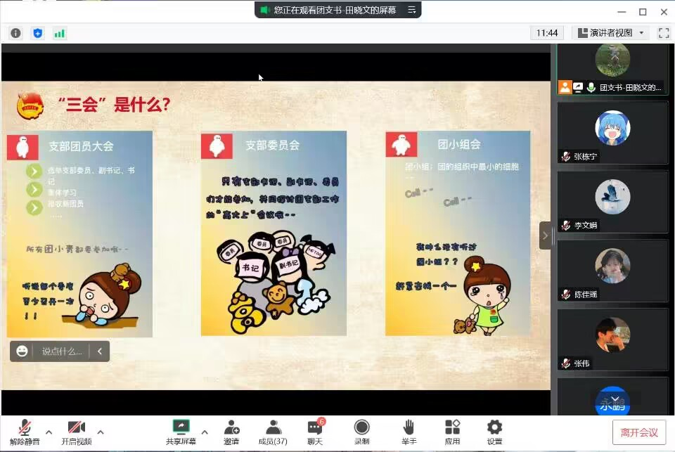 田晓文介绍了各个团小组组长和团支部相关委员以及相关工作,让团支部的成员更加了解团支部的组成以及工作,明确了团员生活,规范了组织纪律,希望支部的团员们在今后的生活中按照团员生活规范要求自己。