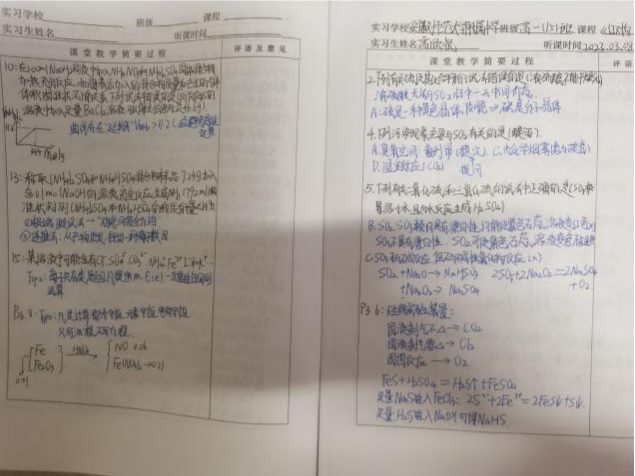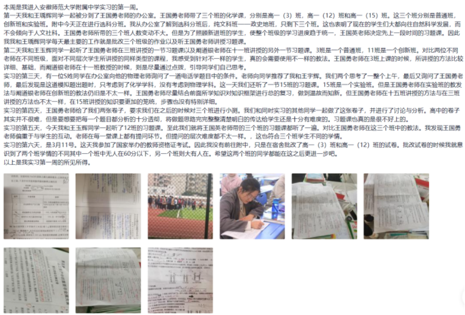 小组成员在适应了新的环境后便迅速投身实习工作。大部分组员以听课、批改作业等工作为主,积极和指导老师沟通,主动询问老师是否有需要完成的任务。在批改完作业后,小组主动和指导老师对接,将作业中出错较多的问题进行收集和整理,并向老师作简短的汇报,以让教师更好了解班级学生对知识点的掌握情况。利用周末休息时间,小组10名成员分享自己这一周的体会和感悟,讨论不同老师上课的特点、长处,并整理、上传听课笔记供小组内部参考、学习。处于教学一线的附中老师的课堂生动有趣,知识点讲解深入浅出,令实习小组受益匪浅。在讲授新课的课堂上,老师们善于引用生活中的实例来加强学生对知识点的理解;在上习题课时,对于基础较为薄弱的班级,老师们会放慢讲解的速度,会引导学生回忆课堂讲过的内容,而对于基础比较好的班级,老师则往往对关键的问题进行讲解,解决学生思路中的错误。