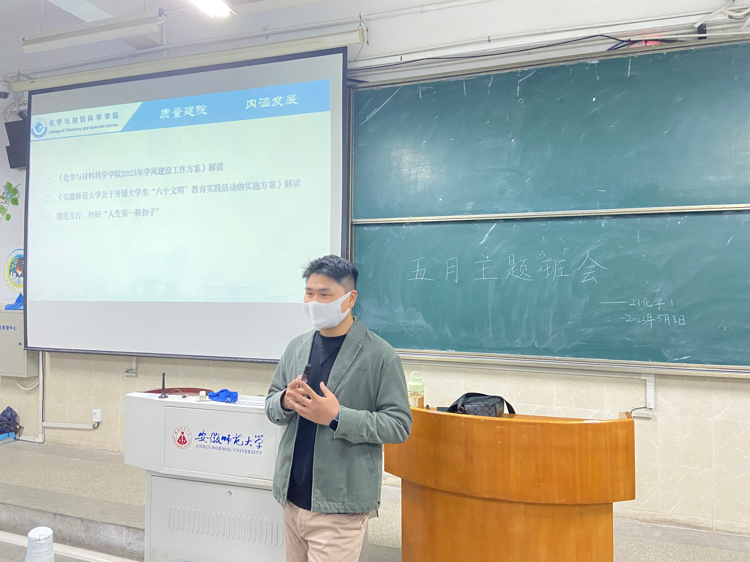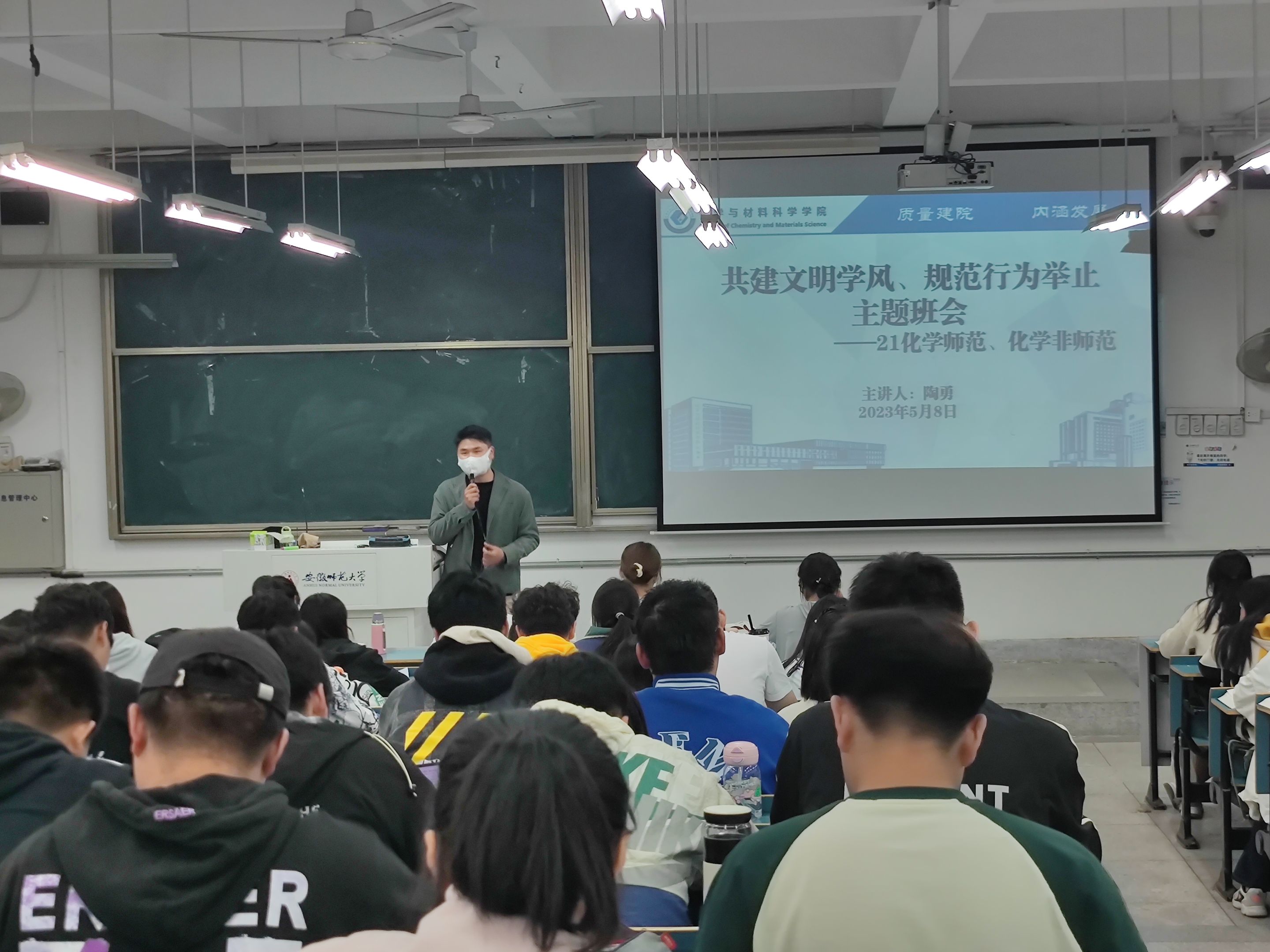 张雨萍、陶勇)为扎实开展“爱师大·共奋进”大学生“六个文明”教育实践活动,营造良好的班风、学风、室风,2023年5月8日晚在行知楼2010504和2070201教室,辅导员陶勇分别为21级化学师范、化学非师范专业的全体学生开展了主题为“共建文明学风,规范行为举止”主题班会。