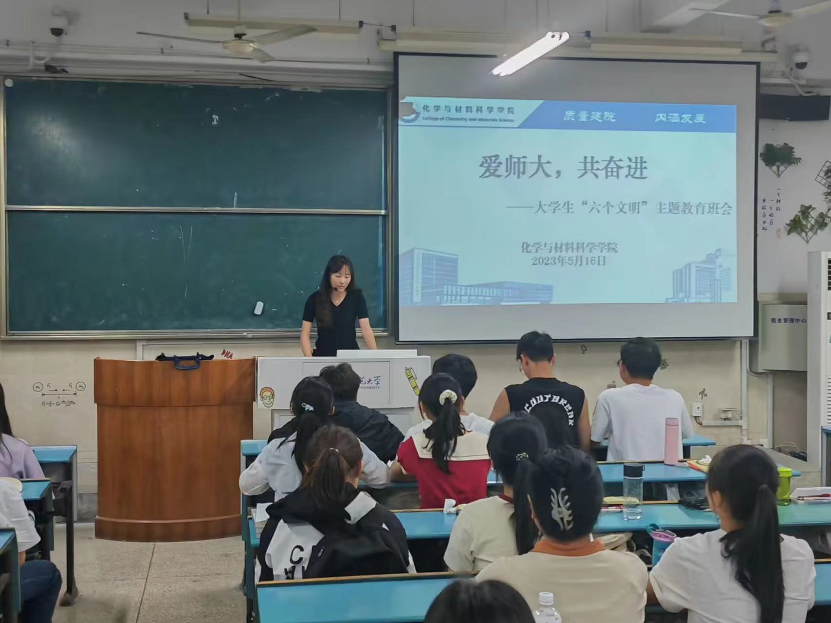 毛雨嫣)为全面贯彻落实习近平新时代中国特色社会主义思想,强化诚信意识,树立诚信担当,进一步提高学生的文明素质教育,培养学生爱仁意识,2023年5月16日下午在行知楼1号楼302、303教室,辅导员吴钰濛老师为2022级化师、化非班全体同学开展了以“爱师大,共奋进”为主题的大学生“六个文明”主题教育班会暨诚信教育主题班会。
