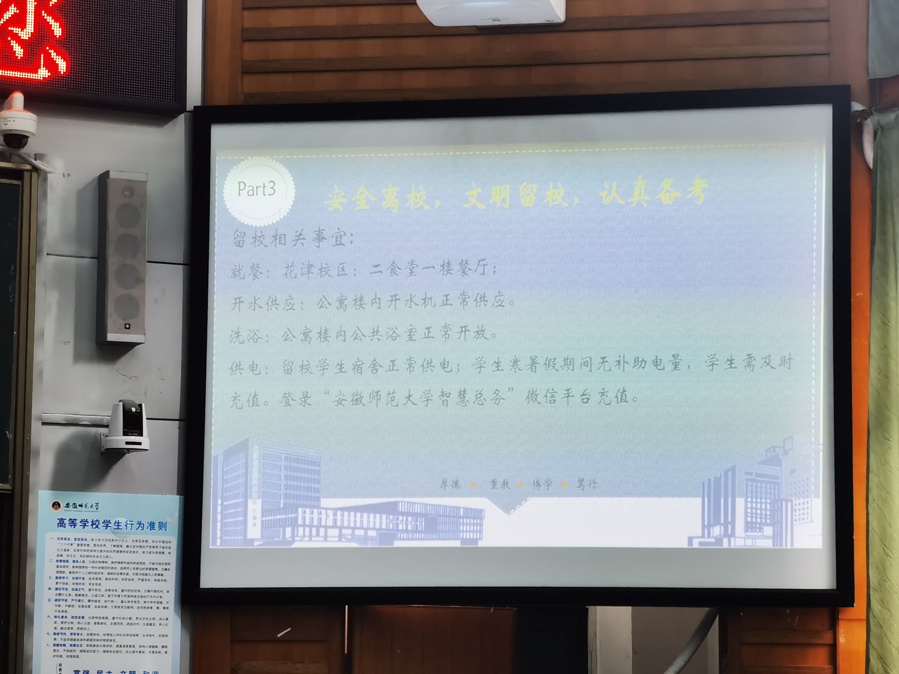 邓乐君、王芳)为切实做好2023年暑假留校学生安全教育,提高留校学生的安全防范意识,保证在校备战考研的效率,维护学校安全稳定,6月15日下午在行知楼1号楼105教室召开了以“暑期安全离校、文明留校暨诚信考试教育”为主题的班会,班会由2020级专职辅导员王芳主持,20级化师、化非、应化在校学生到场参加。
