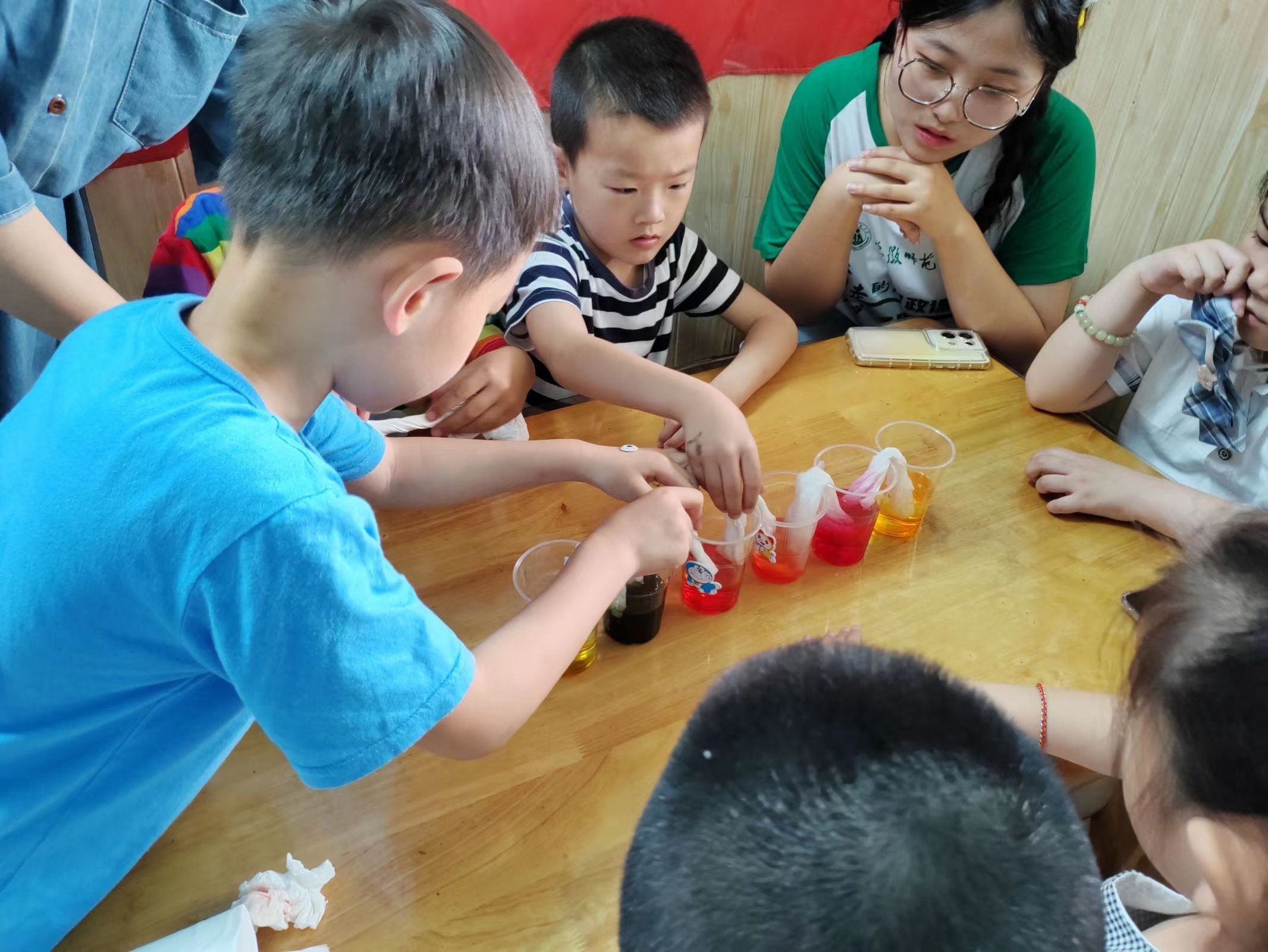 杯中彩虹启思考,科学理念奠根基。在汽水实验的气氛烘托下,第二个实验——“杯中彩虹”更是令人期待。当纸巾两端分别插入不同颜色的溶液中时,所有人静静观察杯中的现象,两种颜色在纸巾交汇,形成“彩虹”。实验员耐心讲解这一原理,小朋友们豁然开朗,在实验中享受科学知识带来的快乐。孩子是国家的未来和民族的希望,一颗颗小小的科学种子植根于小朋友的心中,小朋友们对科学产生兴趣,团队成员们十分高兴,希望能够让更多的年轻一代爱上化学,为打造科学的社会氛围贡献自己的绵薄之力。