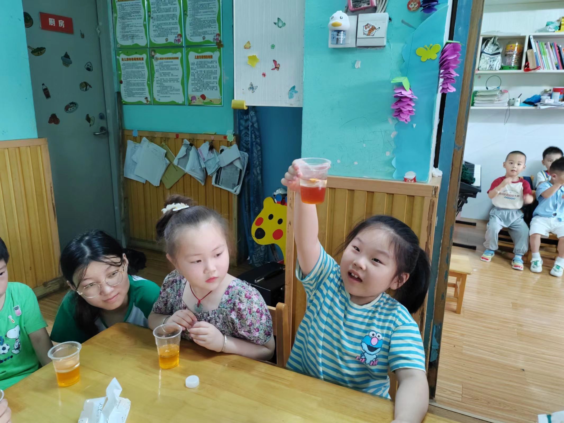 汽水实验引注意,科普启蒙正进行。在讲解环境保护的相关知识后,实验员带领小朋友们进行化学实验。正值炎炎夏日,很多小朋友都喜欢清凉解暑的汽水,团队的第一个实验就是带领小朋友们自制汽水,随着气泡源源不断地涌出,小朋友们发出惊叹声。 “我以后也要学化学,我要做好多好多颜色的汽水!” 其中一名小朋友分享她的奇妙感受。