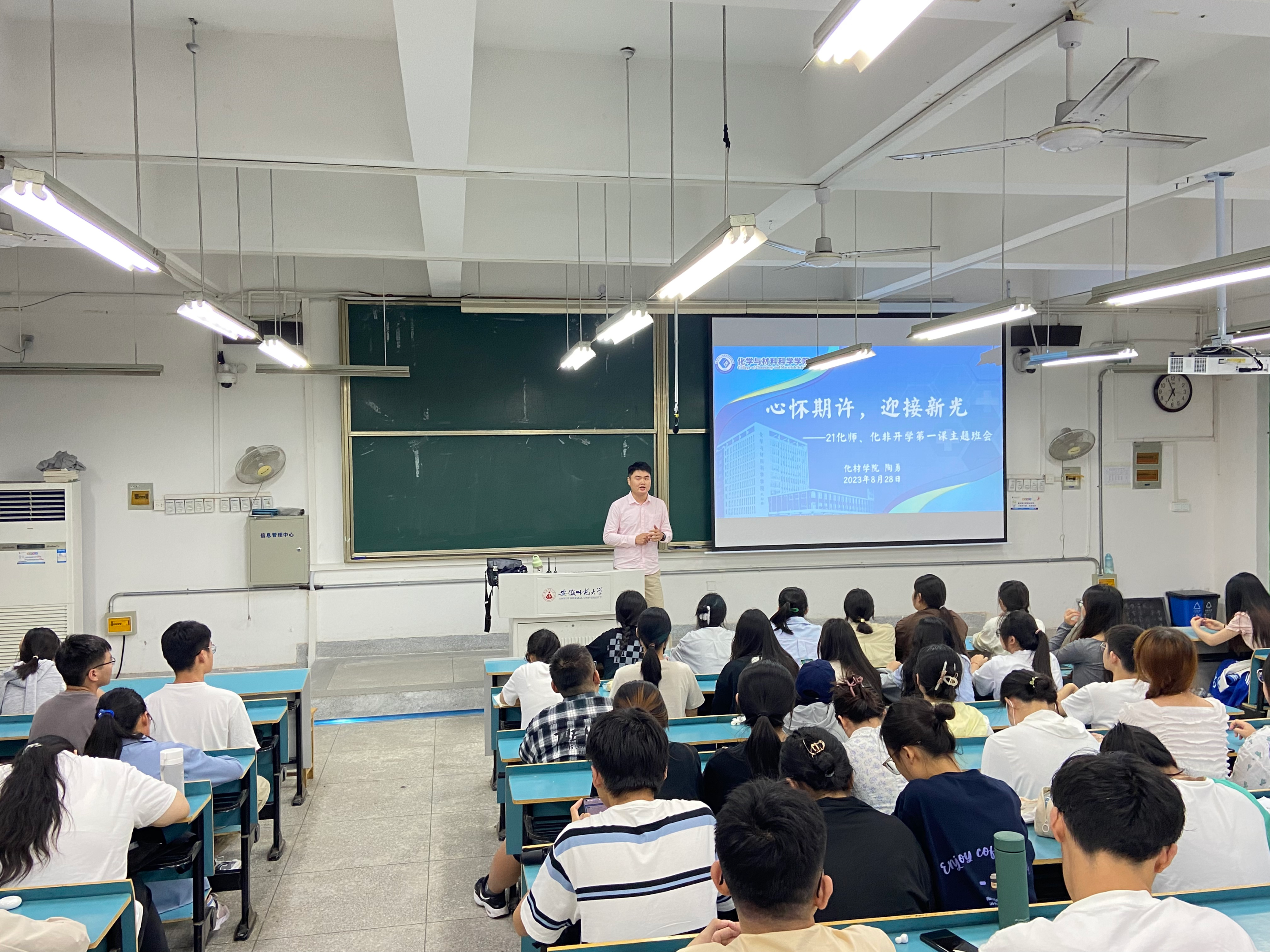 新学期,新征程,新收获,为帮助同学们尽快适应返校后的校园学习和生活,以饱满的精神状态和昂扬的奋进姿态开启新学期,8月28日晚,21化学师范、化学(非师范)专业全体同学在行知楼2070201教室参加了“心怀期许,迎接新光”——开学第一课主题班会,会议由辅导员陶勇主持。