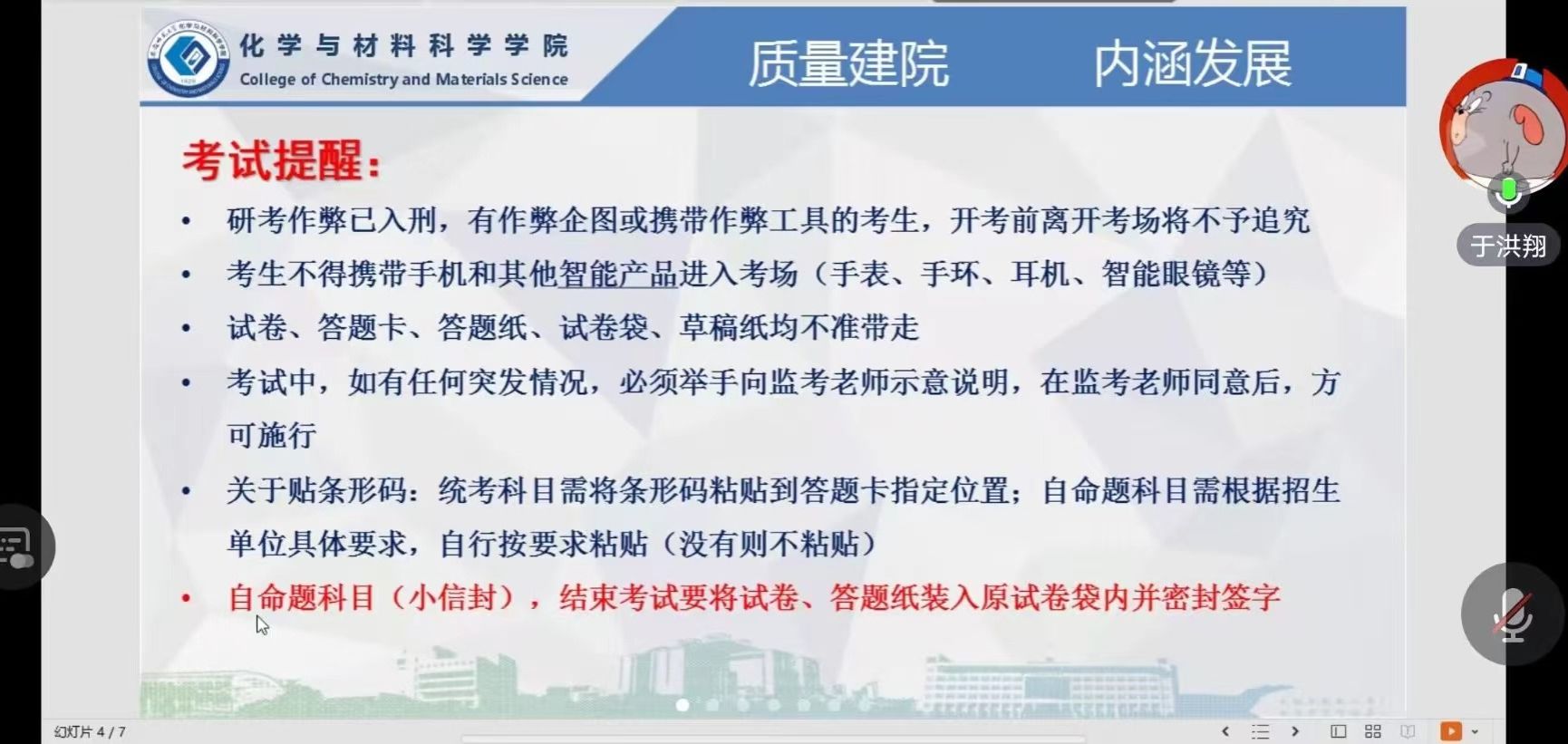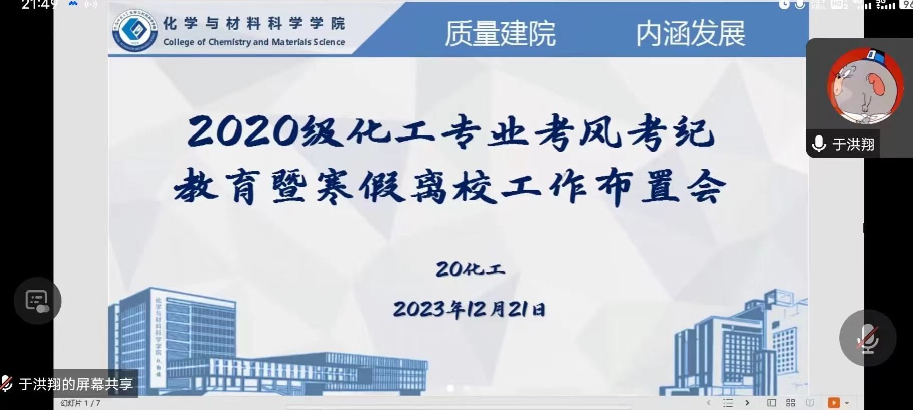 于洪翔)为加强研究生考试考风考纪教育,确保考试的公平公正性,同时为寒假离校工作做好准备,2023年12月21日晚,于洪翔老师为2020级化学工程与工艺专业全体同学召开线上考风考纪教育暨寒假离校工作布置会。