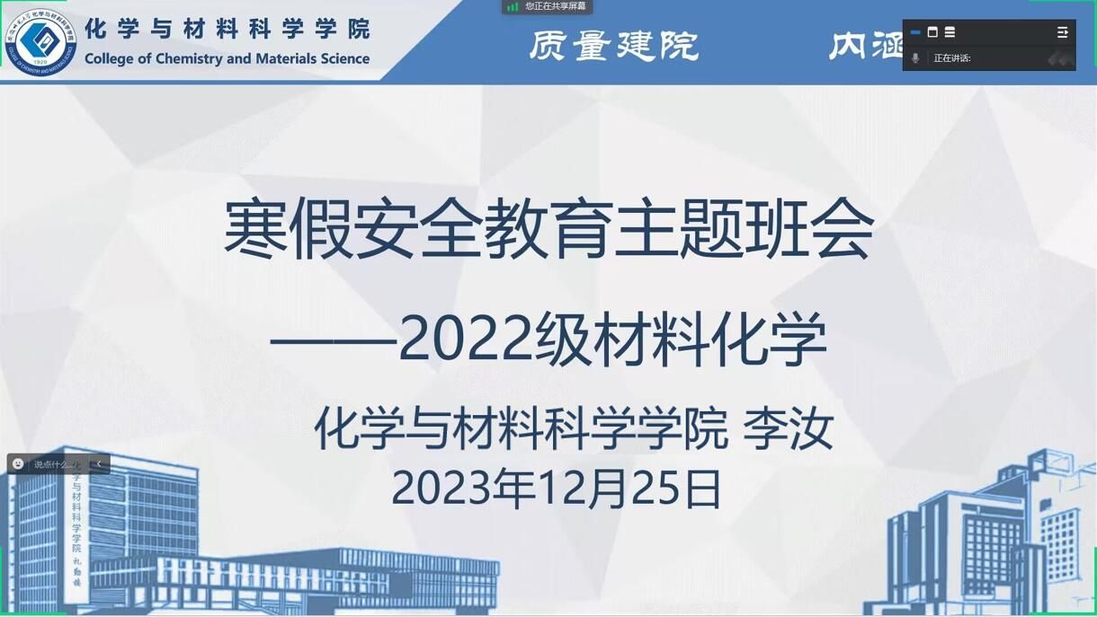 李汝)为确保学生寒假期间的安全与健康,2022级材料化学专业于2023年12月25日召开了线上寒假离校及安全教育主题班会,旨在全面指导学生做好离校准备,并强调寒假安全要点。