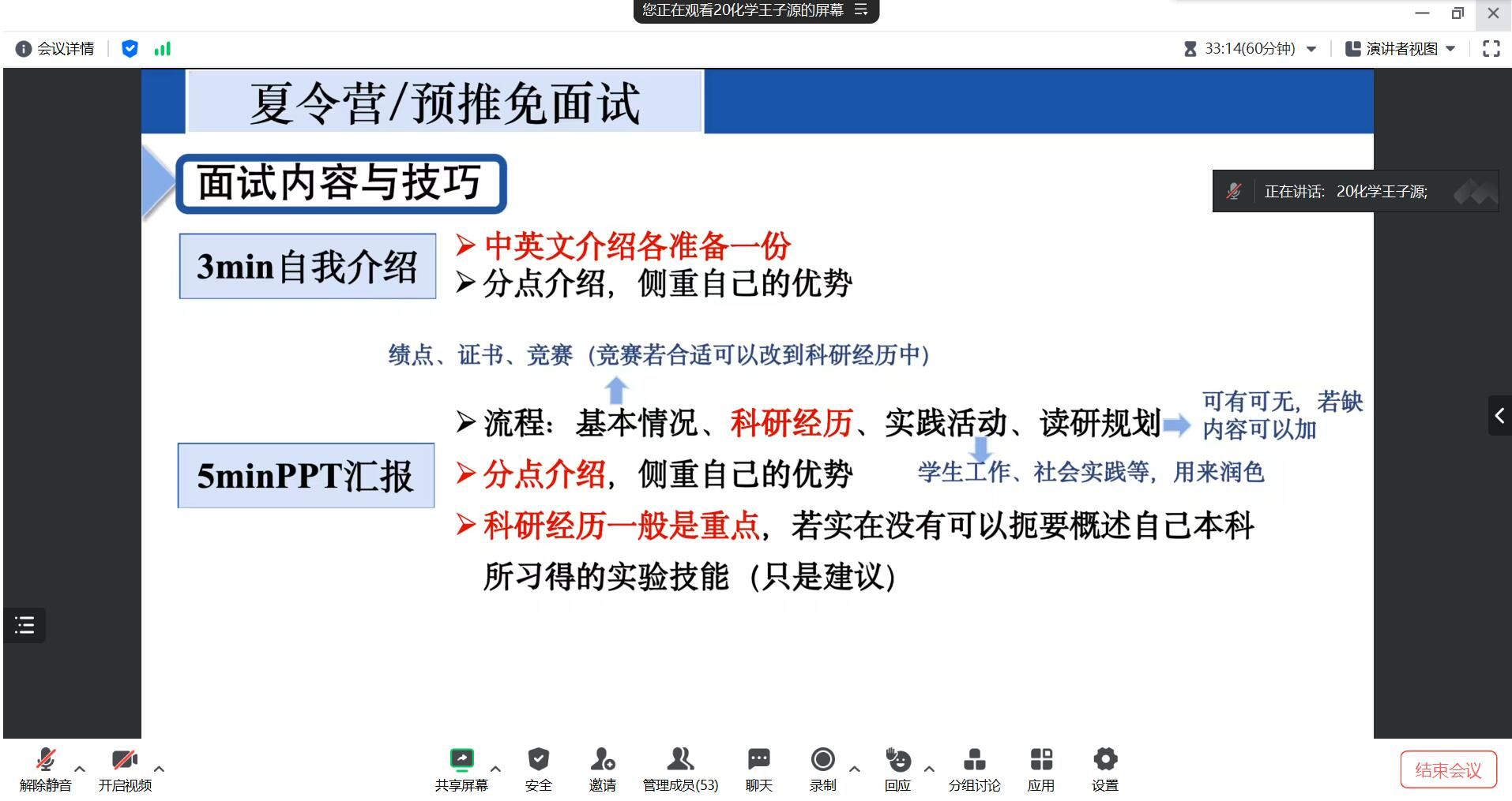 胡悦悦从推免流程、推免择校、推免考核三部分重点介绍了推免的基本流程和注意事项,她建议同学们应打好专业基础,积极各类学科竞赛,提高专业素养。王子源重点介绍了个人暑期夏令营相关经验及注意事项,他建议同学们多关注学校的政策文件,以便及时获取相关信息。黄宁宁结合个人两年的研究生学习经历,详细阐述了推免面试的注意事项及如何平衡好研究生期间的学业,鼓励同学们培养学术研究兴趣,保持优秀专业成绩。三位同学就推免的专业、高校、夏令营等内容与参会同学进行深入交流。