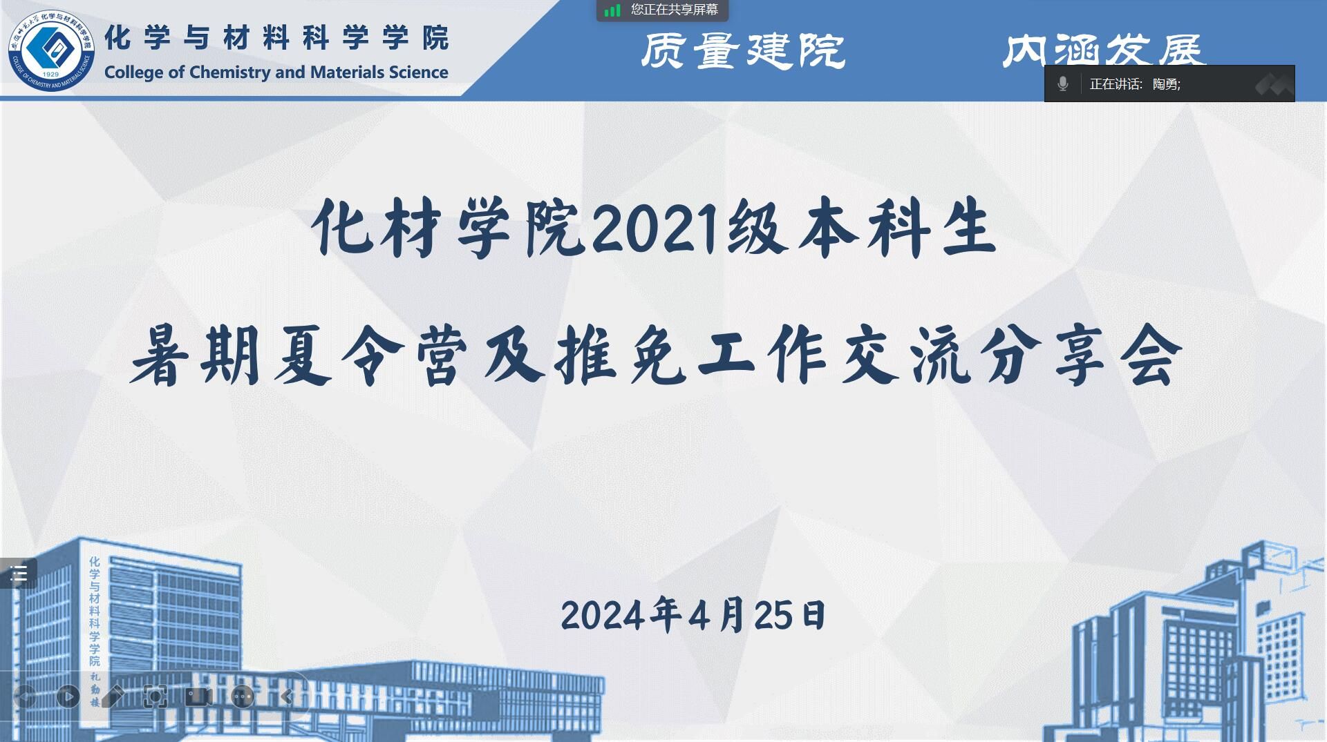 陶勇)为增强学生“五一”假期的安全意识,提高学生自我防护能力,4月25日晚,辅导员陶勇为21化学师范、化学非师范专业全体同学开展了2024年“五一假期安全教育暨推免工作政策解读与经验分享会”,全体同学线上参会。