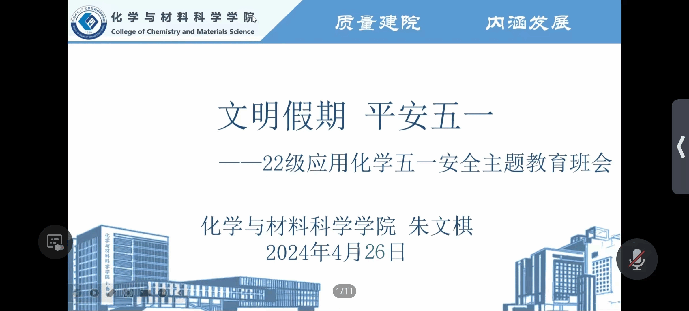 朱文棋 王冰娴)为提高同学们的安全意识,确保大家度过一个平安、愉快的五一假期,2024年4月26日下午3点,朱文棋老师召开了“文明假期,平安五一”安全主题班会。本次班会旨在教育同学们合理规划假期生活,提高安全防范意识以及体验劳动之美等。