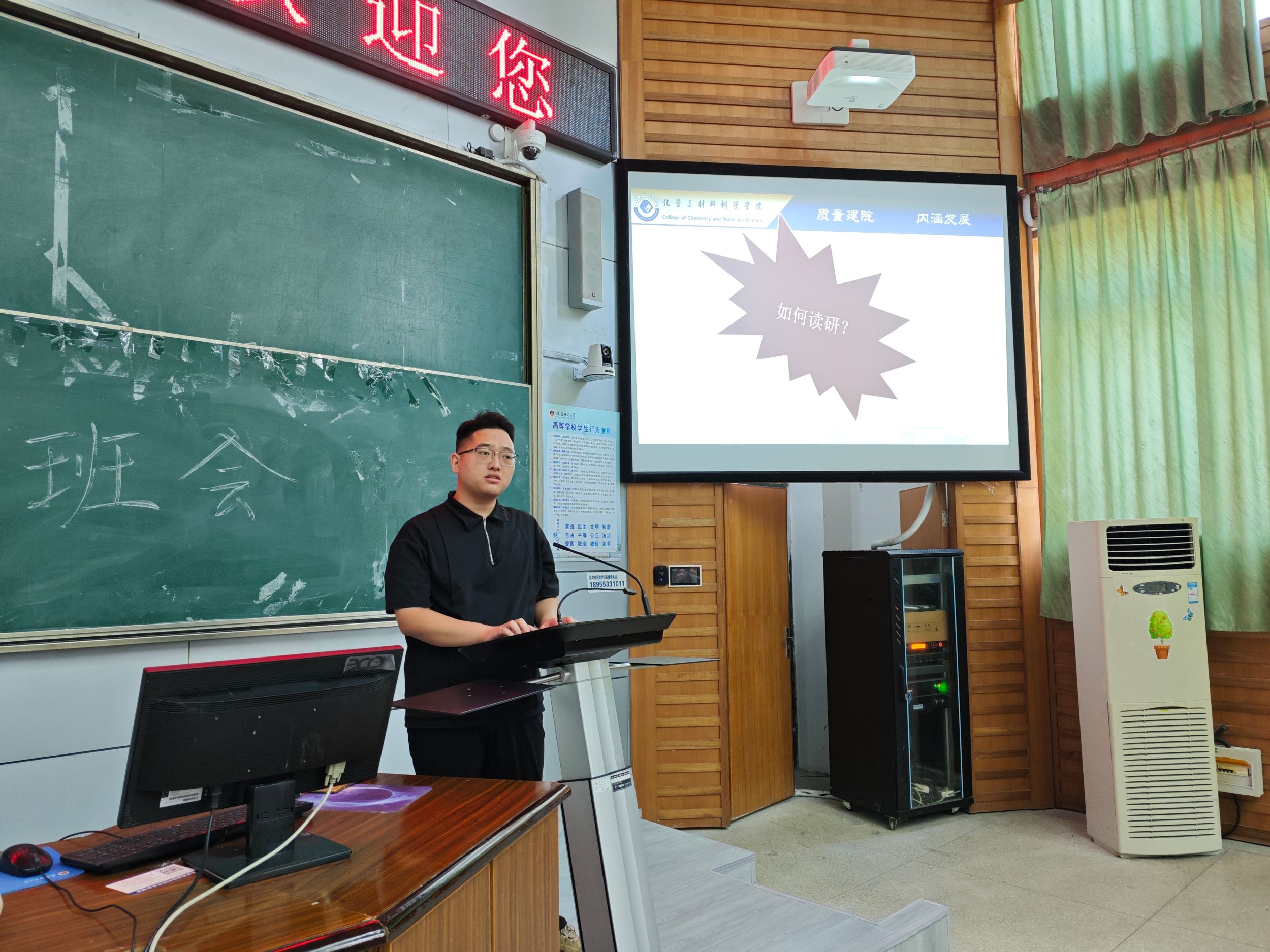 刘云春勉励与会新生明确奋斗目标,提升自己,努力奋斗,在这个过程定然会有成功也会有挫折,只要彼此相互帮助,相互鼓励,不畏不改,定然能实现心中的理想。其次,刘云春从校史、院史、研究生管理组织、新生的总体情况、班委的选拔办法、校院研究生学生组织以及化学专业各个研究方向的导师信息等方面进行介绍。而后,刘云春邀请2024级化学专业博士生孙营柱分享硕士期间的学习与思考。孙营柱分享学习经验,强调自主学习的重要性,激励同学多读文献勤实践,遇到问题多与导师沟通交流,实验的过程中不能怕吃苦,在失败中不断总结,提高自己的科研能力。