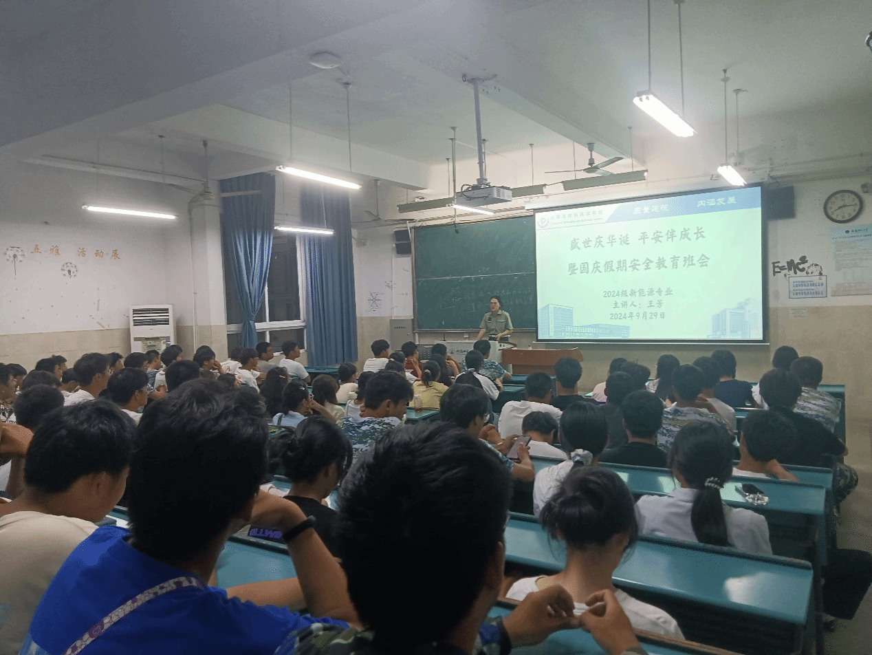 2024级辅导员王芳老师于2024年9月29日在1号教学楼2010201与2010202教室分批召开了“盛世庆华诞,平安伴成长”暨国庆假期安全与教育班会。24级新能源材料与器件,应用化学,化学工程与工艺全体同学参加。