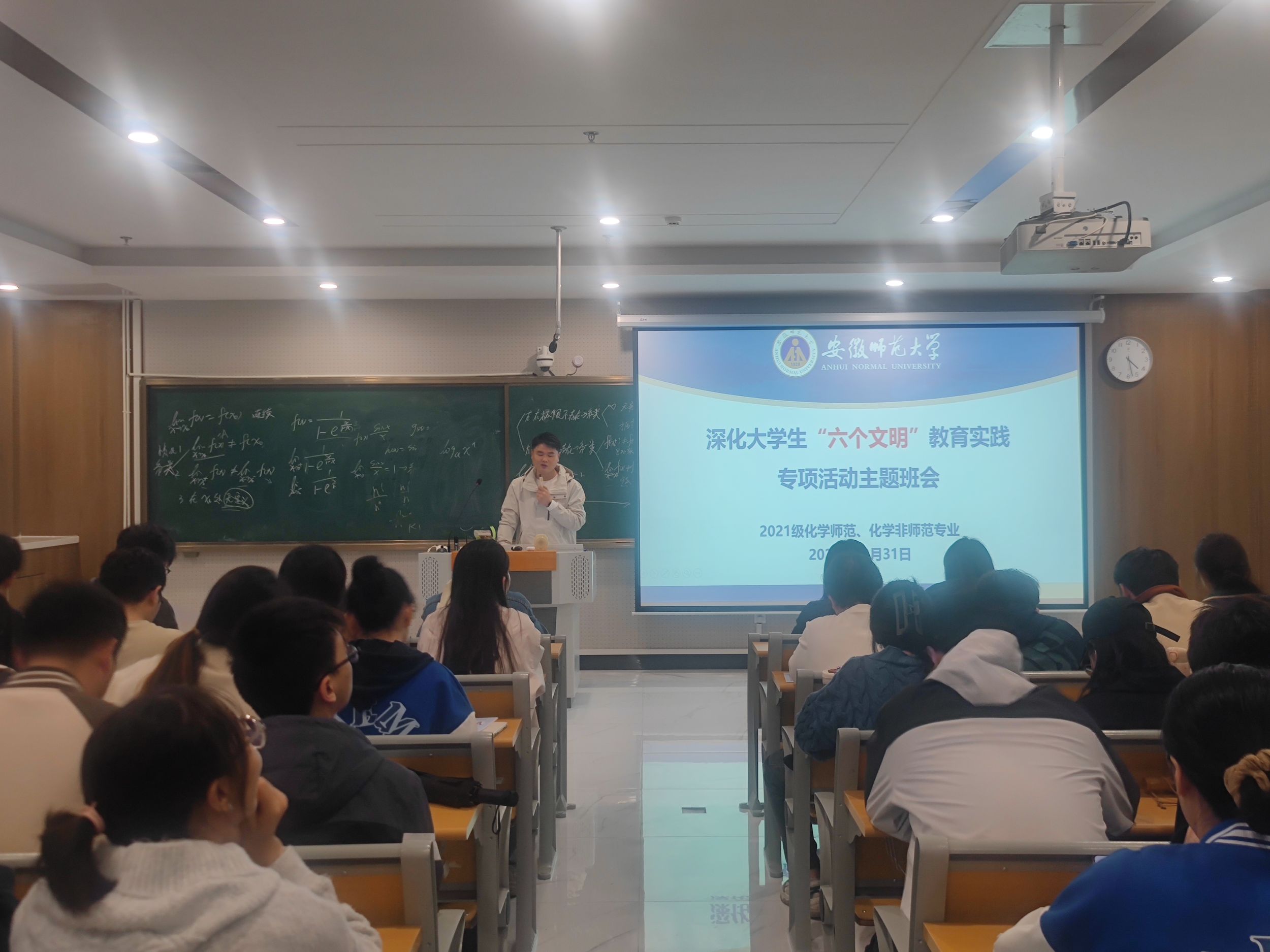为深入学习贯彻党的二十届三中全会精神,认真学习习近平总书记考察安徽讲话精神,提升大学生文明素养。21级化师、化非专业于10月31日下午在清源楼C407教室召开深化大学生"六个文明"教育实践专项活动主题班会。此次班会由辅导员陶勇老师主持,陶勇老师结合班级同学生活实际,详细阐述了“六个文明”教育实践专项活动的具体内容和重要意义,旨在引导各位同学能够遵守道德规范,树立良好形象。