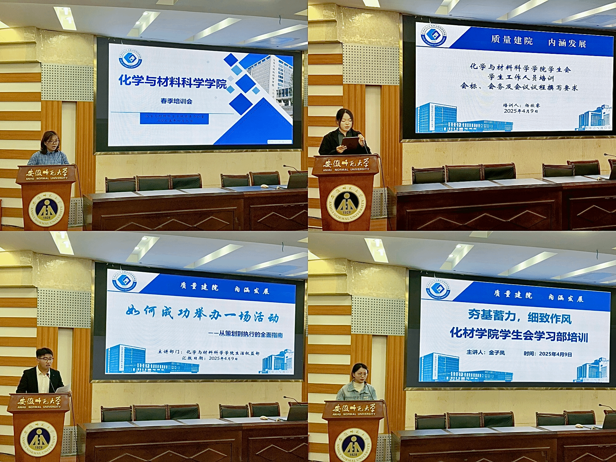 宣传部部长陈瑶就如何撰写校园新闻展开发言,从新闻的定义和通用格式出发,阐述了新闻的构成,讲解写新闻报告的注意事项和拍摄照片的技巧;文体部部长张硕以“如何编写文体策划案”为切入点,从策划书的具体格式到策划案的具体内容的撰写;组织部部长赵也讲述了撰写红头文件的规范与实务培训;生权部部长吴凡从活动策划、活动布置、活动进行以及总结反思四个方面讲述了该如何开展一个成功的活动;办公室部长洪育果就申请和报销两个方面,深刻阐述了办公室在活动中扮演的角色;学习部部长金子凤从工作内容、材料整理、活动协调等方面,讲述了学习部的功能与职责,并阐明了做好工作的要求;素拓部部长董梦涵就“什么是第二课堂”展开介绍,详细的讲述了素拓部的工作和要求;综合部部长邬童以综合部的任务和工作展开讲话,从如何做好会标和做好会务工作进行汇报,讲述了综合部的职责与义务。