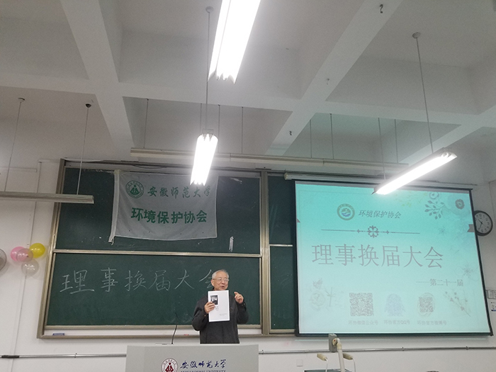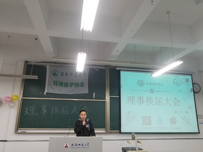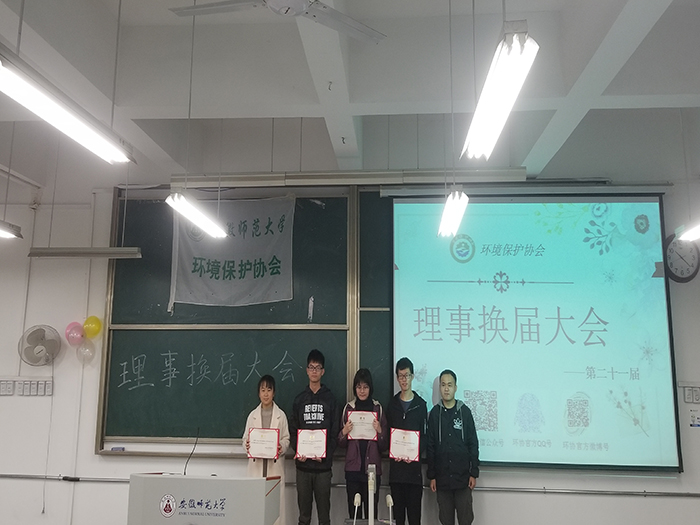 大会以文艺部带来的《相亲相爱一家人》拉开序幕。动听的歌声后,环协八个部门依次通过PPT的形式向大家介绍了部门概况以及留任部员信息,并为新任理事颁发聘书。一张张精美的图片,一段段积极飞扬的音乐,还有创意独特的宣传片,在场的同学们不时发出阵阵赞叹与掌声。随后又进行了各副会长和各部长聘书的颁布。接着,宫世国老师为新任会长郭泽宇、新任理事长吴琼颁发了聘书。郭泽宇上台发言,表达了对各理事的感谢,希望能与大家共同促进协会未来的发展。之后新任理事代表杨志发言,表达了对环协真诚的祝福,说出了在场理事的心声。大会最后,由宫老师作为指导老师上台,提出了他寄予协会的希望以及未来一年里工作的指导。他还指出了习近平主席对于生态环境的保护十分重视,提醒协会的成员们要勿忘初心,坚持环保。大会圆满结束。