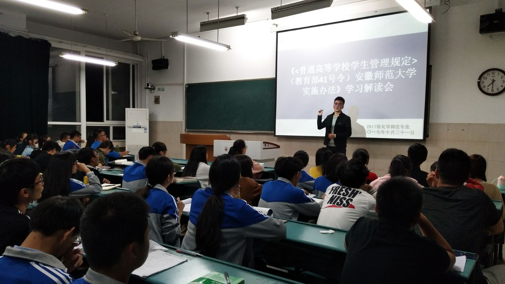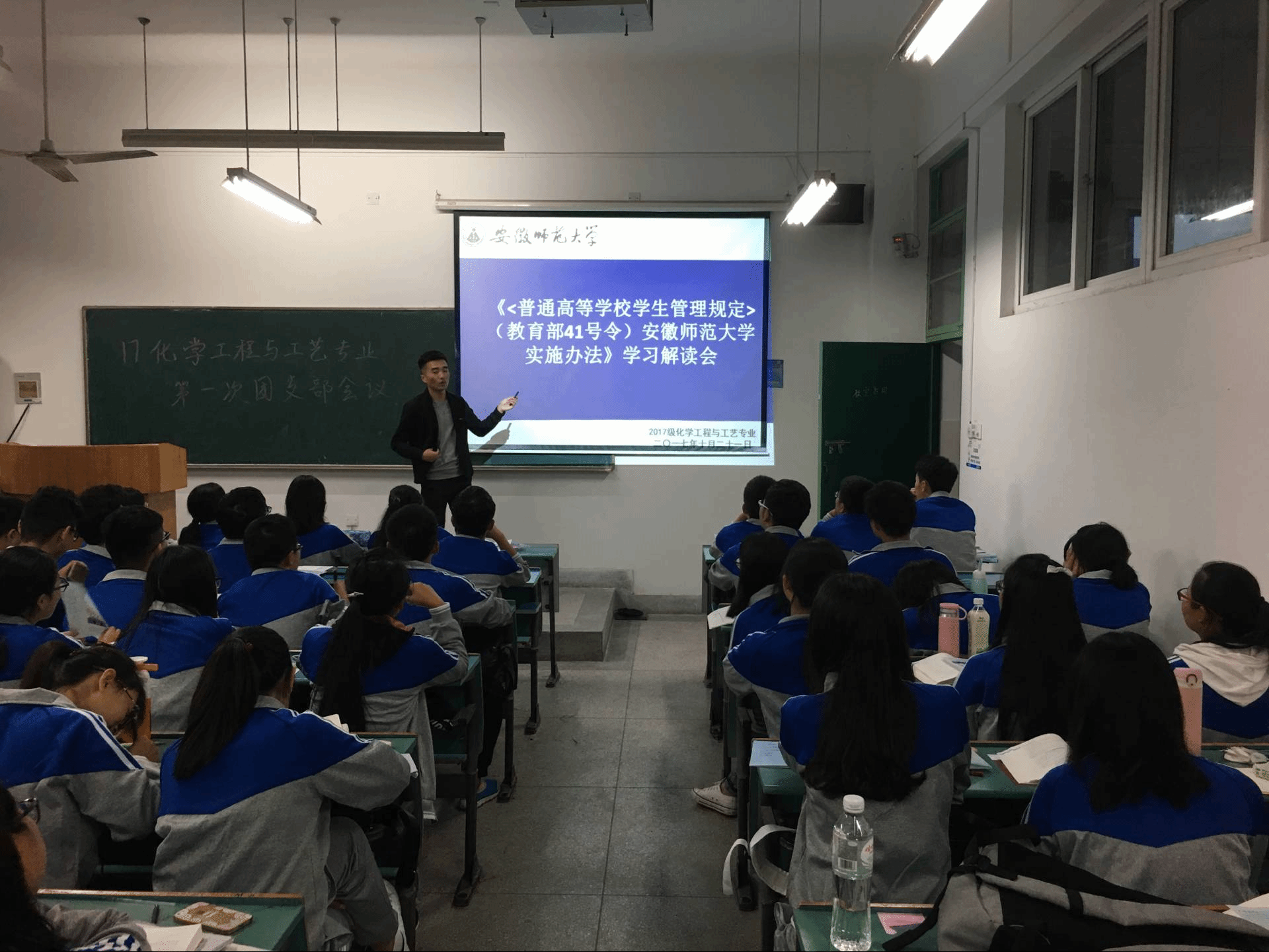 本网讯(2017级化工 方子妍)10月22日晚,在班级辅导员王雨兵的组织下,2017级化学师范与化学工程与工艺专业召开了关于《< 普通高等学校学生管理规定>(教育部41号令)包子漫画 实施办法》的学习解读会,此次学习解读会极具教育意义。