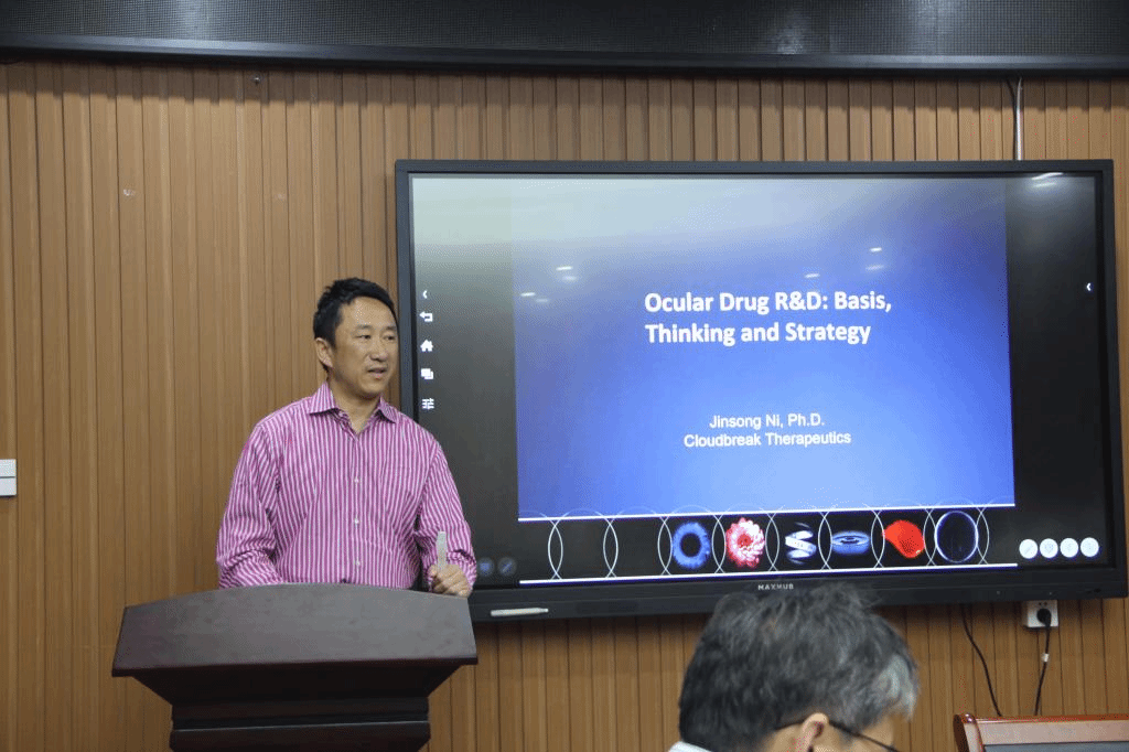 倪劲松教授作了题为“OcularDrug R&D:Basis,Thinking and Strategy”的学术报告。倪劲松教授首先向大家简要地介绍了他的学习研究经历及科研领域,然后向大家介绍了药物研发到临床经历的过程,并向大家阐述了其临床试验过程的复杂性和严谨性,第一阶段:健康志愿者的安全研究;第二阶段:有限规模的疗效研究;第三阶段:大量患者新药应用对比研究;第四阶段:监管审查,继续对比研究。接着着重介绍了眼部用药的发展、常见眼疾、局部给药和全身给药的不同。会后,倪劲松教授就本次报告内容与在座师生进行了热烈而友好的互动交流。
