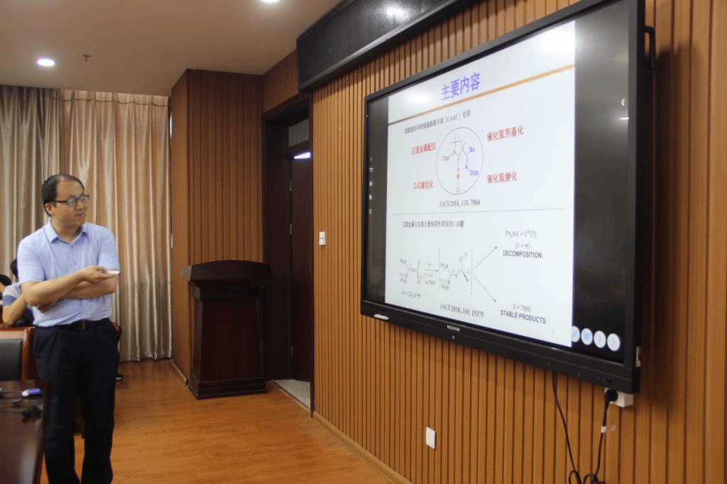 楚甲祥博士作了题为“官能团化卡宾和氮宾配体对过渡金属反应性能的调控”的学术报告,详细介绍了其课题组近几年的研究进展,其中包括:一、官能团化环状烷基胺基卡宾(CAAC)的合成及在金属有机化学中的应用其中包括,官能团化CAAC的合成,含膦侧链的CAAC前体的配位化学,一价金的氧化合成,催化氢芳基化等研究;二、过渡金属-主族元素协同作用在自由基转移反应中的应用,其中包括VPO催化机理研究,模型化合物的设计,过渡金属与主族元素之间的“电子交流”等研究。会后,楚甲祥教授就本次报告内容与在座师生进行了热烈而友好的互动交流。