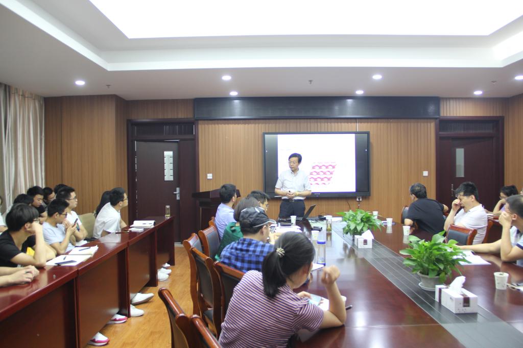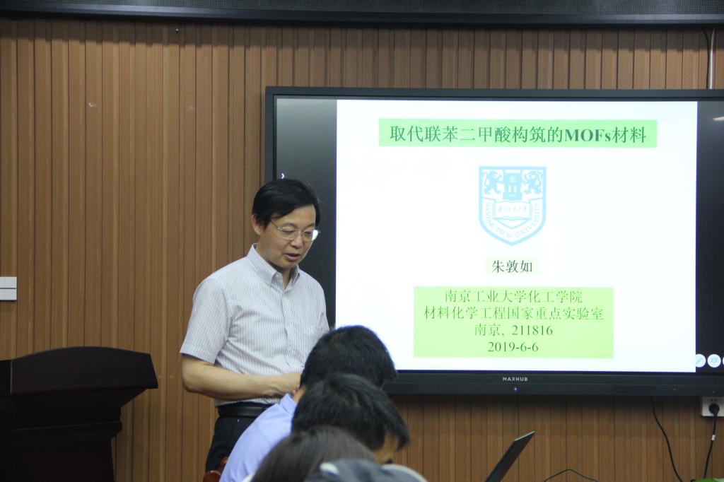 朱敦如教授作了题为“取代联苯二甲酸构筑的MOFs材料”的学术报告。朱教授主要介绍了其课题组的MOFs材料研究,MOFs材料即金属有机框架,有较大比表面积和孔体积,已然成为新一代的多孔材料。其设计过程为:配体设计然后接不同取代基,其次接不同的金属离子或者簇从而获得不同MOFs材料。MOFs材料在分离、传感、磁性、药物缓释、分子储存等方面有较好的应用前景和价值。会后,与会师生就朱教授报告内容进行了深入讨论和交流。