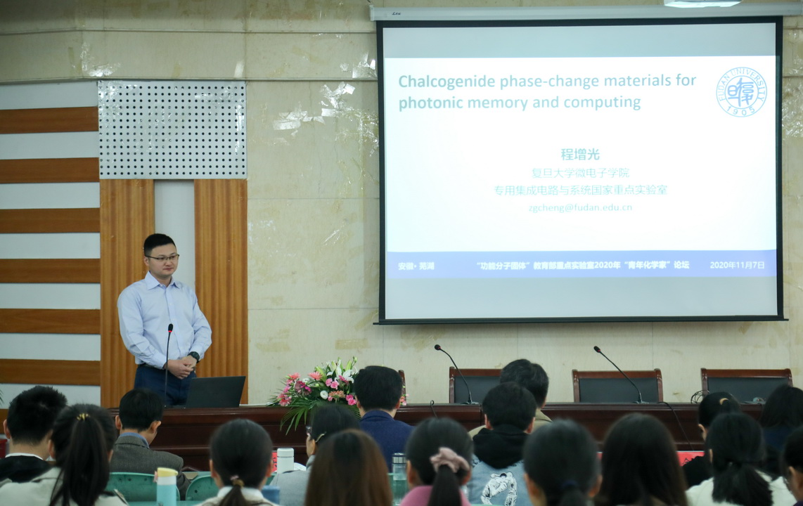 本次论坛共有5场专家报告,复旦大学程增光研究员作题为“Chalcogenide phase-change materials for photonic memory and computing”的报告;南开大学刘定斌教授报告题目为“癌症早期诊断策略思考”,华南理工大学刘锦斌教授围绕“发光金属纳米成像探针”介绍了课题组的相关工作,国家纳米科学中心李乐乐研究员作了“时-空”可控精准生物成像及疾病诊疗的报告,西安交通大学赵永席教授围绕“单细胞分子网络分析”进行了详细介绍。报告人在分享自己课题组研究成果的过程中针对化学领域中的研究热点、难点进行了精彩的学术报告,并与在座师生围绕相关学术问题展开深入的交流与讨论。报告现场气氛热烈,学术氛围浓厚。