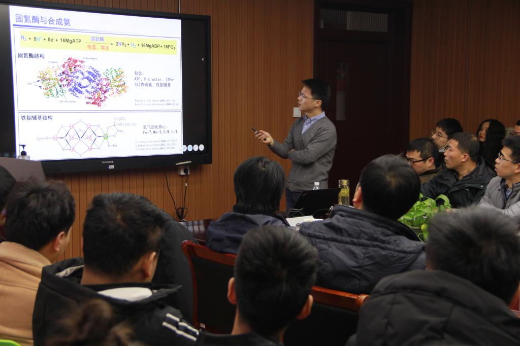 胡少伟教授作了题为“多核钛金属氢化物的合成以及在氮气和其他惰性小分子活化中的应用”的学术报告。胡教授首先简要介绍了氮元素的重要性,分析了氮的化学性质以及工业合成氨的机理研究与局限性。随后介绍了新型高活性多核金属氢化物的设计合成。着重讲述了其工作团队研究多金属协同活化惰性化学键的过程和实现惰性分子的功能化转化,举例阐述了三核钛金属氢化物对氮气的活化、三核钛金属氢化物对苯环的活化、三核钛金属氢化物对吡啶的活化以及三核钛金属氢化物对一氧化碳的活化。会后,胡教授就本次报告内容与在座师生进行了热烈而友好的互动交流。