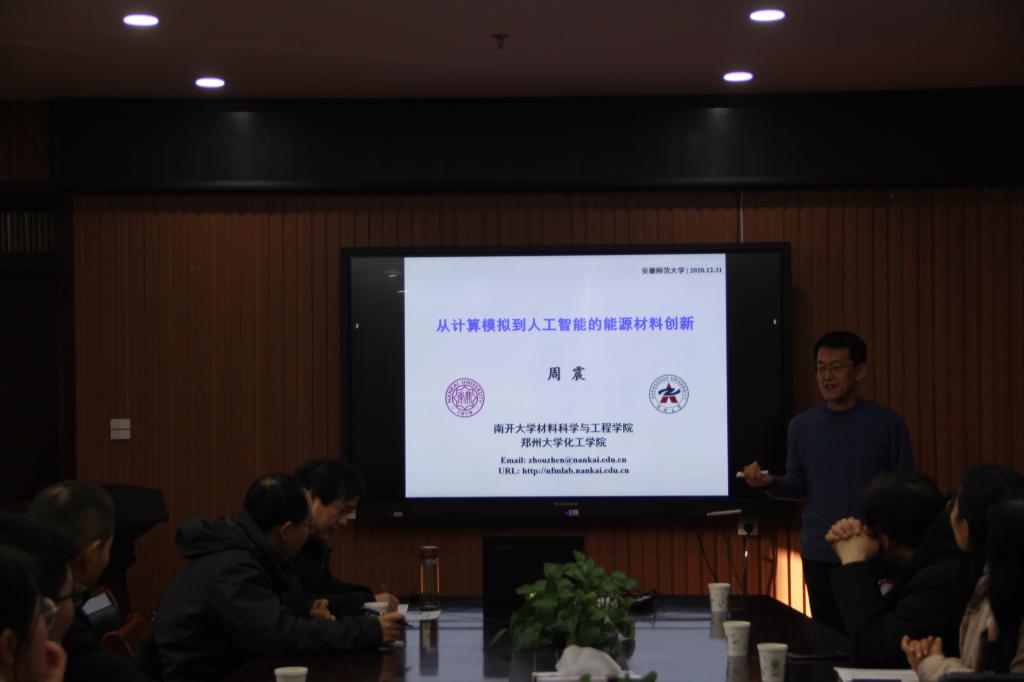周震教授作了题为“从计算机模拟到人工智能的能源材料创新”的学术报告。周教授首先从新能源的储存与转化开始,介绍计算机辅助研发的重要性及意义,并举例说明数据库如何筛选出我们预期的功能性材料。随后介绍了高能量密度电池,并设计构建生物质电池材料,通过用Clar理论解释有机电极材料的电压,找到符合我们期望的有机材料,而且可以通过电池初期的电池容量来模拟计算电池寿命,大大减少实验时间和数量,这对未来的研究方向有重要影响。与会师生与周震教授进行了热烈而友好的互动交流。会后,周震教授还听取了黄玉成课题组研究生汇报,并对其研究工作进行了指导。