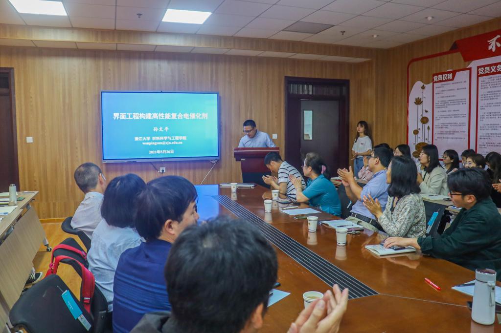 孙文平研究员作了题为“界面工程构建高性能复合催化剂”的学术报告。孙研究员首先简要地介绍了电解水制氢与燃料电池技术相关研究背景,然后分别从表、界面工程如何构建高性能催化剂进行了阐述。就界面工程方面,着眼于二维/片状催化剂载体材料,以非碳基功能性载体材料,如g-C3N4和h-BN和碳基功能性载体材料,如N-doped carbon nanosheet和Ni,N-doped carbon nanosheet为例,从材料应用的角度为大家举例说明,此外还提出利用界面工程中限域效应、电子转移效应、协同效应、配位效应、应力效应构建的异质结构电催化剂可达1+1>2的效果。孙研究员团队始终从发现问题到解决问题,深层次解释材料高性能的原因所在,目标性改善材料的功能缺陷,给我们提供了科学的研究思考。会后,孙研究员就本次报告内容与在座师生进行了热烈而友好的互动交流。