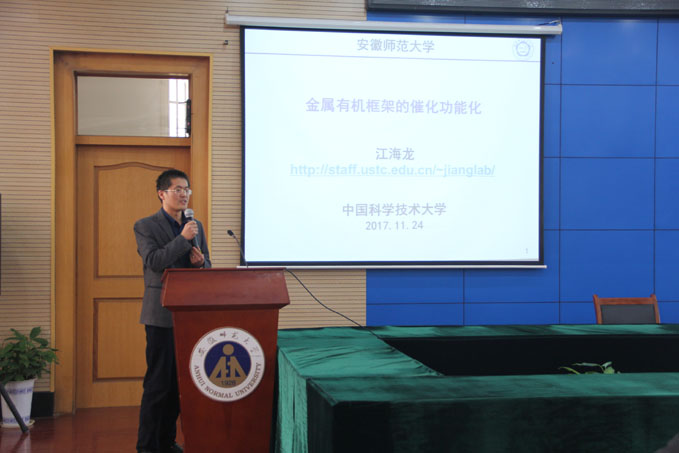 江海龙教授作了题为“金属有机框架的催化功能化”的学术报告。江教授首先介绍了当前金属有机框架的研究背景以及自己课题组在活性位点及稳定性两个方面的研究思路。同时详细讲述了稳定MOFs合成和孔空间功能化等方面存在的挑战。在最后互动交流中,江教授强调了设计研究思路中逻辑框架建立的重要性,使得与会师生受益良多。