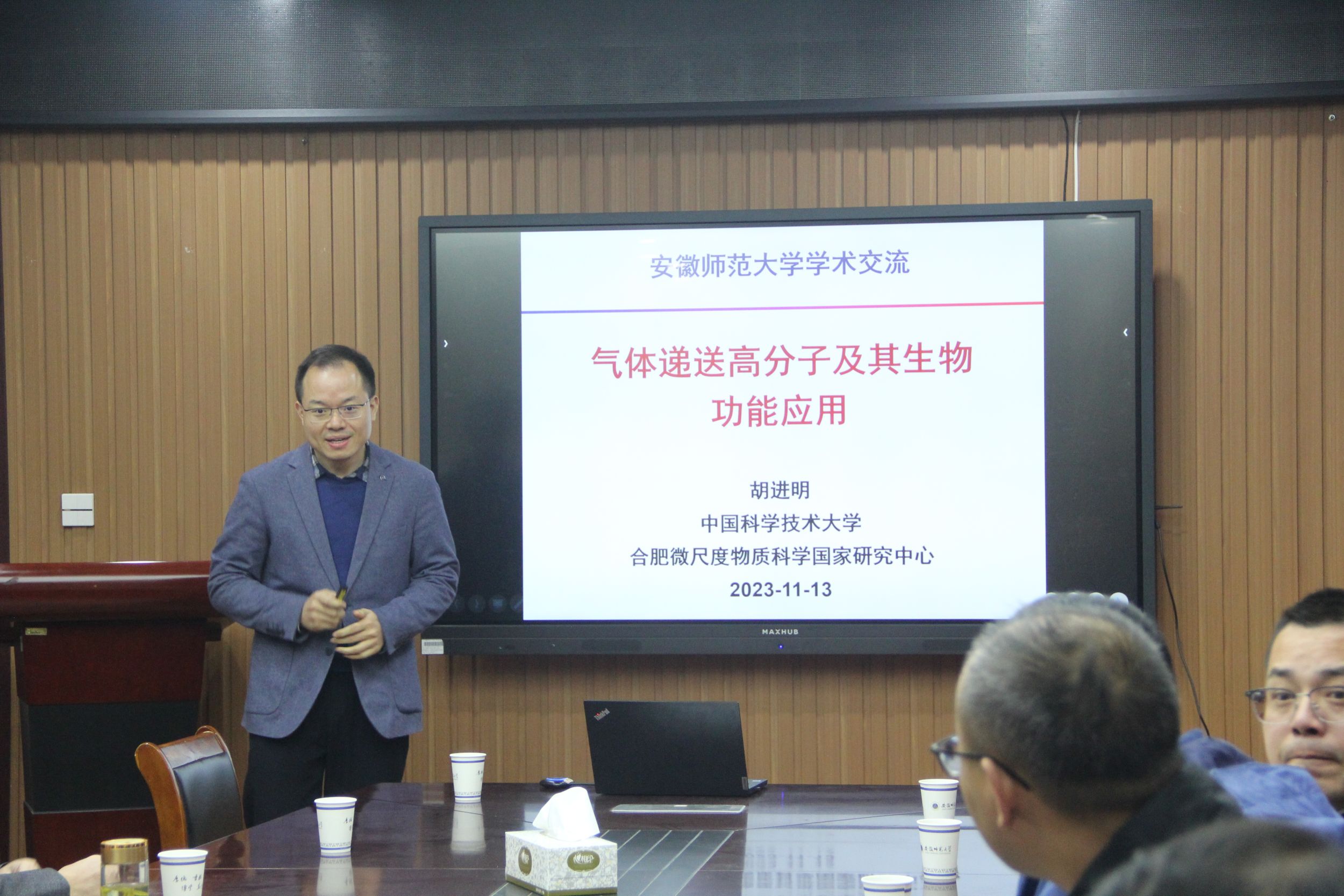 胡进明教授作了题为“气体递送高分子及其生物功能应用”的学术报告。胡教授讲解了通过创制响应性聚气体递质高分子材料实现了气体递质高效负载与可控释放;提出了新型气体递质供体活化机理,实现了临床光疗窗口响应性释放;发展了多种气体递质同步调控策略,实现了气体递质功能协同与疗效增强。会后,胡进明教授与与会师生展开了一系列学术讨论,并回答了与会师生提出的问题。