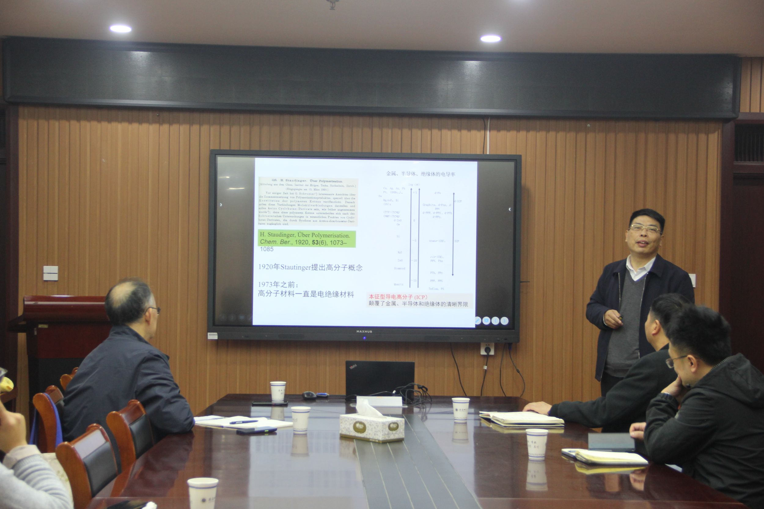王献红教授作了题为“从聚苯胺到二氧化碳基高分子材料”的学术报告。王教授阐述了对高分子合成化学和工业应用的体会:首先是创新的合成化学带来新品种高分子,其次是面对高分子工业大厦庞大规模所带来的高强度防守(性价比),必须与高分子物理相结合,找到新性能才能实现破防进入工业化。随后,王教授围绕高分子合成化学创新:高分子工业的源泉;高分子物理与化学的结合:新性能与性价比相结合;工业导向的例子,从聚苯胺到二氧化碳羰基高分子材料三个方面进行了详细的讲解。会后,王献红教授与与会师生展开了一系列学术讨论,并回答了与会师生提出的问题。