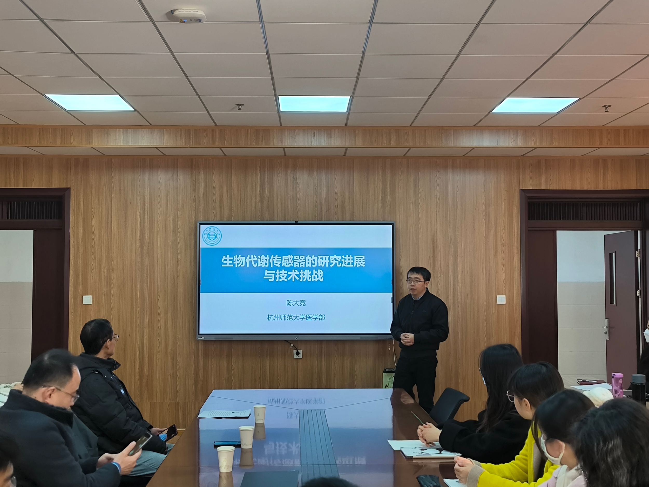 陈大竞教授作了题为“生物代谢传感器的研究进展与技术挑战”的学术报告。陈教授首先讲解了生物传感器的概念、糖尿病的概念,指出糖尿病是一组以高血糖为特征的代谢性疾病。高血糖则是由于胰岛素分泌缺陷或其生物作用受损;糖尿病会导致各种组织,特别是眼、肾、心脏、血管、神经的慢性损害,严重时可危及生命。随后陈教授围绕糖尿病检测,介绍了血糖监测技术,第一类是指血检测,第二类是连续血糖监测技术,分为全植入式GCM系统和微创GCM系统。接着陈教授介绍了血糖传感器的研发与产业化,以及血糖连续检测的国外品牌,分析了国产GCM核心电极性能不足,市场份额低的行业现状,并指出了未来该领域的发展方向;最后陈教授介绍了血糖连续检测的技术难点、微创连续血糖传感的关键技术以及连续血糖监测技术的衍生应用。会后,陈大竞教授与参会师生展开了一系列学术讨论,并回答了参会师生提出的问题。