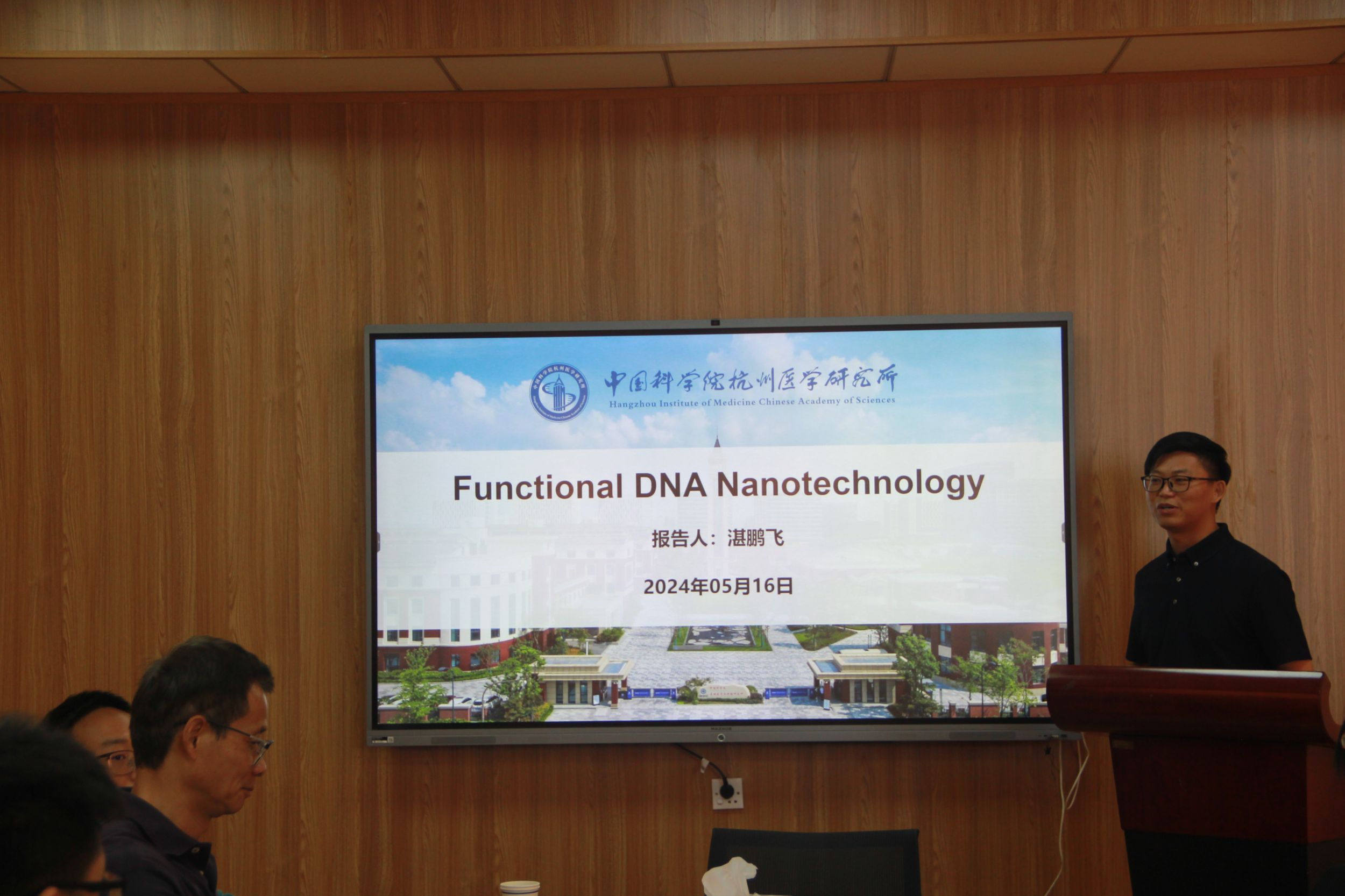湛鹏飞研究员作了题为“功能化的DNA纳米技术”的学术报告。湛鹏飞研究员的报告围绕 “仿生DNA分子机器的构筑” “DNA分子机器的功能调控”以及“基于DNA分子机器在仿生细胞上的研究”等三个方面进行阐述。湛研究员首先介绍了DNA折纸技术和DNA分子机器以及DNA分子机器的构筑及功能调控,随后湛研究员阐述了面对如何在时空层面精确驱动DNA分子机器的挑战,给出了“Toehold mediated strands displacement”策略,精准时空传感控制,构筑多种仿生运动系统;利用DNA多位点协同作用调节功能元件间构筑关系,实现生物信号分子的分析;利用DNA可编程性,设计应对不同目标分析物的DNA分子机器实现生物分子的特异性识别和信号响应;构建仿生细胞器,拓展仿生细胞体系生物传感功能。会后,湛鹏飞研究员与参会师生展开了一系列学术讨论,并回答了与会师生提出的问题。