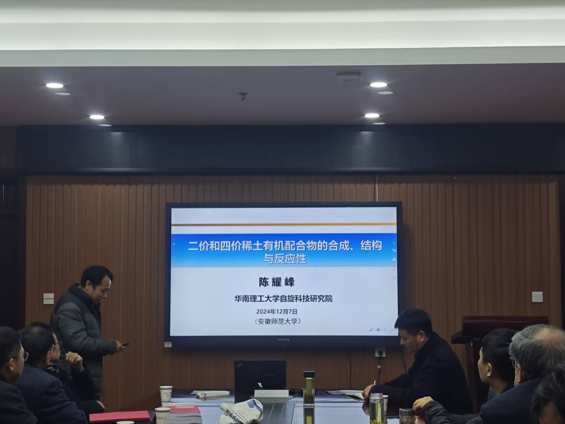 陈耀峰教授作了题为“二价和四价稀土有机配合物的合成、结构与反应性”的学术报告。陈耀峰教授首先讲述了稀土元素的基本性质、二价稀土烷基配合物及氢化物的合成、结构与反应性和四价铺烷基和腾基配合物的合成、结构与反应性。随后陈教授介绍了众多不同的二价稀土烷基配合物及氢化物,以及四价稀土烷基和膦基配合物的合成的挑战性和研究背景。最后陈耀峰教授以幽默风趣的话语向与会师生介绍了科研过程中的种种趣事。会后,陈耀峰教授与参会师生展开了一系列学术讨论,并回答了与会师生提出的问题。