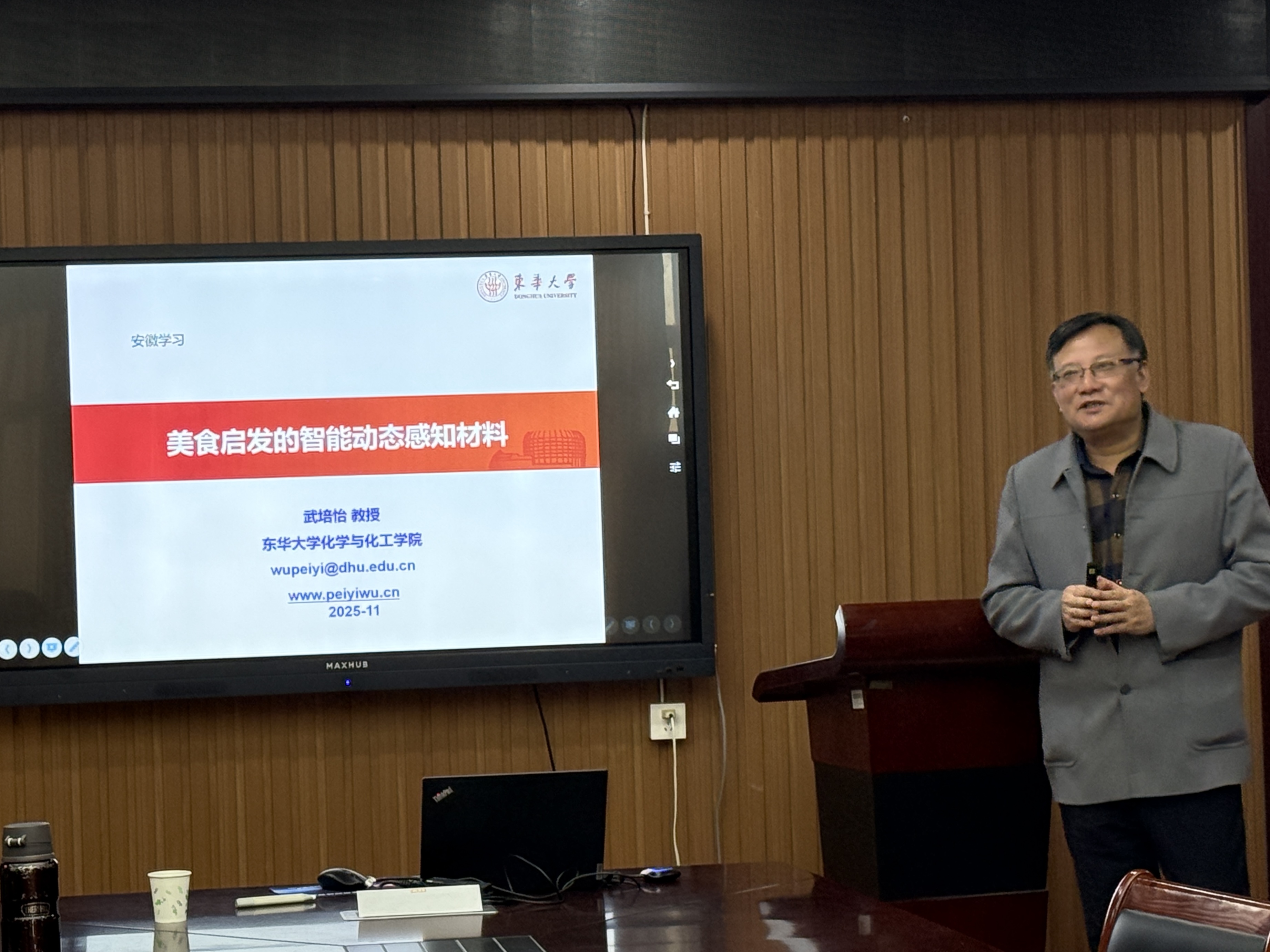 武培怡教授作了题为“美食启发的动态感知材料”的学术报告,武教授讲解了团队以美食为灵感开发的多款智能材料及相关研究成果:先是介绍了原位聚合纺丝凝胶纤维,该材料具备优异的湿气修复、自修复与超收缩性能,还能形成可逆螺旋结构,兼具减震抗冲击特性;同时讲解了加捻纤维类生物体的多模态行为,这类纤维可随环境湿度变化自适应变形,还能制备成纤维机器人实现非线性变形。接着他重点介绍了“可食用的拉面离子皮肤”,该材料依托拉面的面筋网络与淀粉颗粒微观结构,借助双硫键、氢键等作用实现手工塑形、自主自修复等性能,还可作为导电层用于假肢弯曲角度与运动检测,团队还以拉面为启发,通过原位形成无定型CaCO₃优化了仿生离子皮肤的力学性能。随后他讲解了“搅搅糖离子皮肤”的手工充气制备工艺、“甜菜碱系列仿生水凝胶”的自主修复与自由塑形特性,以及通过动态交联网络构筑导电纳米通道、提升感知功能与环境适应性的弹性体离子网络设计。同时他还展示了多款新型功能材料,包括模拟人体皮肤特性的应变硬化自修复离子皮肤、拉伸时电导率大幅提升且兼具远程光热驱动能力的液晶弹性体离子导电纤维、具备优异水下自修复性能的光学伪装离子凝胶,还有能快速实现软硬切换的热致硬化水凝胶纤维、可回收利用的MC-PMAA类塑性水凝胶、模拟神经功能的神经形态水凝胶、兼具高阻尼与自修复性能的离子皮肤、复刻指纹结构实现高灵敏触觉感知的美学离子皮肤,以及兼顾机械性能、离子电导率与结构色的高强韧光子晶体离子弹性体。会后,武培怡教授与参会师生展开了深入的学术讨论,并耐心回答了师生提出的各类问题。