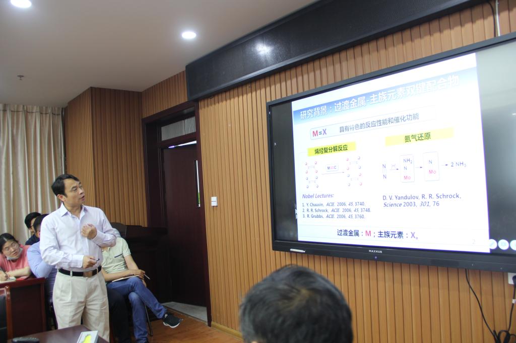 陈耀峰研究员作了题为“稀土—主族元素双键化学”的学术报告。陈耀峰研究员介绍了其课题组通过配体设计成功合成并通过晶体结构表征了首例含稀土-氮双键的稀土末端氮宾配合物-钪末端氮宾配合物,并系统研究了钪末端氮宾配合物在活化元素单质、二氧化碳和氢气以及各种有机小分子的碳-氢键、碳-氟键、碳-碳和碳-杂原子不饱和键等的反应性。随后陈老师介绍了其课题组最近开展的稀土卡宾配合物研究,成功合成了第一例稀土膦基卡宾配合物-钪膦基卡宾配合物,并展示了其高反应性。随后又合成了不含配位性取代基的单核稀土卡宾配合物-钪和镥鏻基卡宾配合物。报告后,与会师生还就稀土金属有机化学的热点问题与陈老师进行了深入交流。