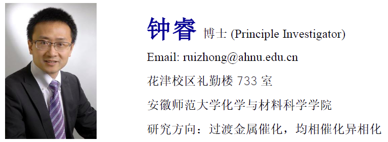 钟睿,教授,博士生导师。2007年于南昌大学理学院化学系获理学学士学位;2011年于复旦大学化学系获理学硕士学位,研究方向为金属有机配合物合成。2015年初毕业于德国慕尼黑工业大学化学系,获理学博士学位,博士期间主要从事氮杂环卡宾过渡金属催化剂的合成、催化性能与固载化研究。2017年4月获清华大学博士后国际交流计划资助,进入清华大学基础分子科学中心开展钴催化负氢转移反应研究。2019年7月加入包子漫画 ,任职于单原子-团簇-纳米中心(李亚栋院士工作室),并开展独立研究工作。
