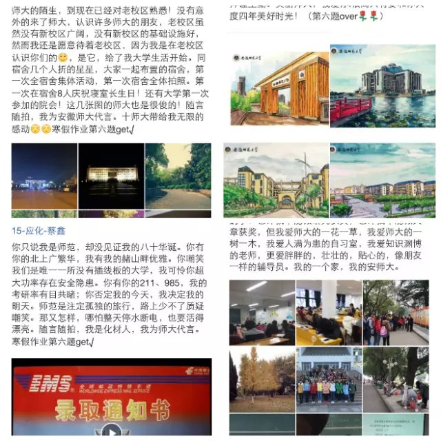 “为师大代言”。作为一名师大学子,无时无刻不怀有一颗师大心。同学们寒假回到家乡,纷纷以QQ、微信、微博等网络形式发布师大的校园风景图片、撰写自己与师大的美丽故事,一段段文字、一幅幅画面,以深情和热爱表达着一个个师大学子的自豪感。同学们在完成作业中,不仅梳理回顾了自己在师大的求学经历,展望着美丽师大的发展蓝图,更进一步抒发了师大学子的爱校荣校情怀。