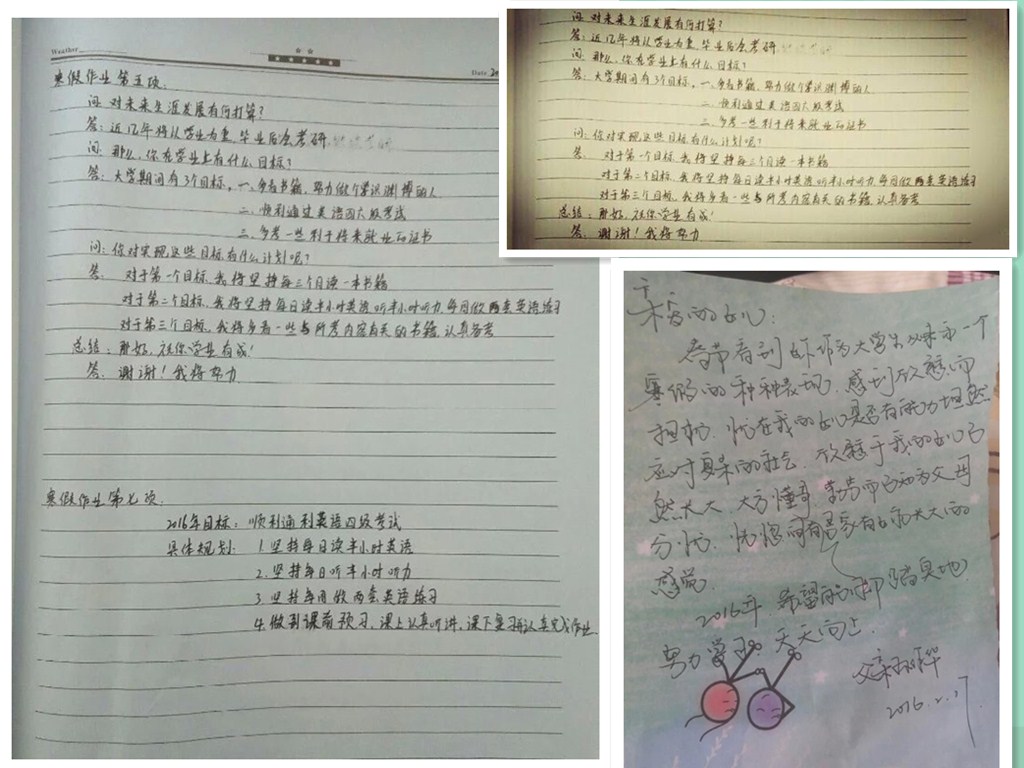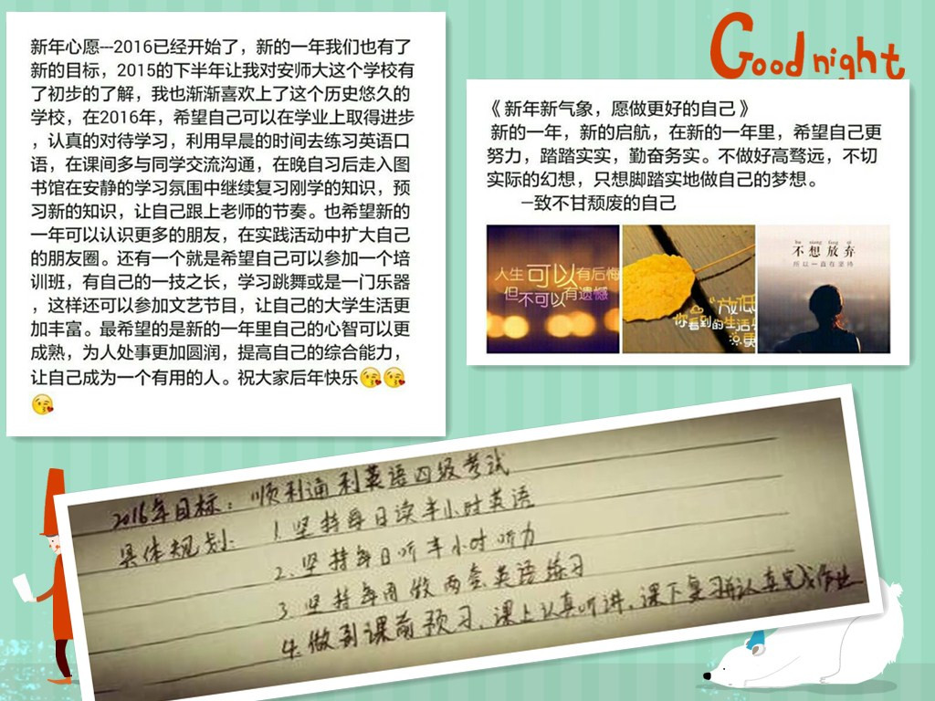 “新年新气象”。假期里,同学们纷纷与自己进行一次深刻地对话,认真总结过去的这个学期的学习、生活和工作,是否达成了自己的心愿,有哪些值得改进,有哪些需要完善,如何让自己的大学之路能变得宽敞而明亮。与自己进行对话,扎扎实实去反思和反省,努力做到对自己能力、素质和知识等的正确估量和评价。面对新的开始,重新去启航自己的新学期,制定一个属于自己的前进方向和目标。