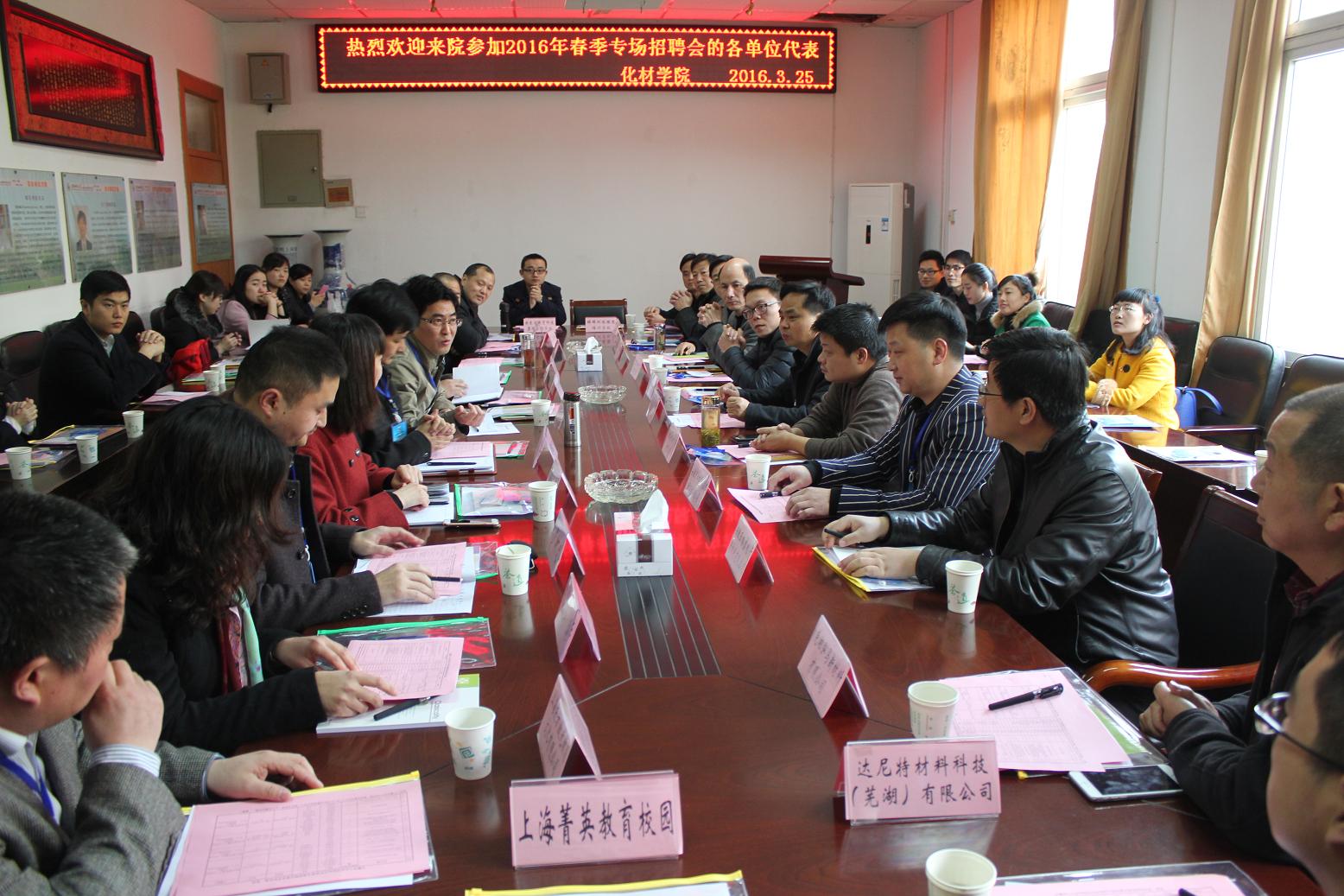 2016年春季专场招聘校企见面会在院会议室隆重召开。学院领导班子成员、各系主任,来自上海、江苏、安徽等16家用人单位代表以及全体学院就业工作组成员参加了本次见面会,会议由院长高峰主持。