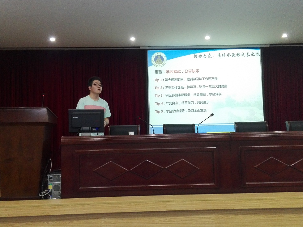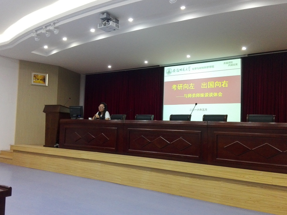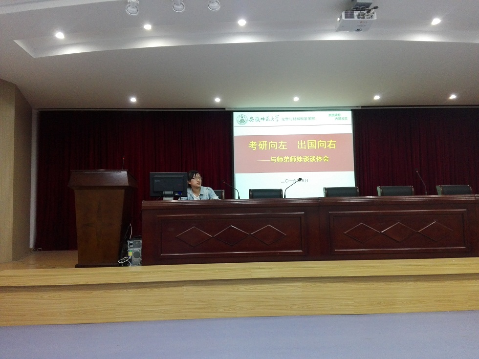 首先向同学们分享经验的是留学美国的徐惠同学,她告诉学弟学妹们首先要确立目标,并为之不懈奋斗,以自己的亲身经历启迪大家如何规划人生。同时,她也把自己留学准备中的遗憾分享给大家,告诫大家韶华易逝,想要出国留学应该在大一就着手准备,提高自身专业实验技能、英语以及专业课成绩。第二位是成功保研至复旦大学的张海宁同学,其以四年专业课第一的成绩折服了现场所有人。他指出大学时光应该学会奉献,分享快乐,争取全面发展,在参与活动时应该广交良友,勇于展示自己。最后一位向同学们分享经验的是顺利考研到长春应化所的张曼丽同学,她从每门课,每本书出发,细致地讲述自己在学习中的经验。说到无机化学,她讲述了自己复习的刻苦,曾经把书前前后后看了很多遍;说到英语作文,她分享每天背诵范文的经历,把自己考研的经历讲述的全面而到位。最后,辅导员魏老师对本次交流会作了总结发言,他用了“坚韧”、“全面”、“踏实”三个词分别来形容三位优秀同学。希望所有同学都能在交流会中受益,确立目标,不懈追求。